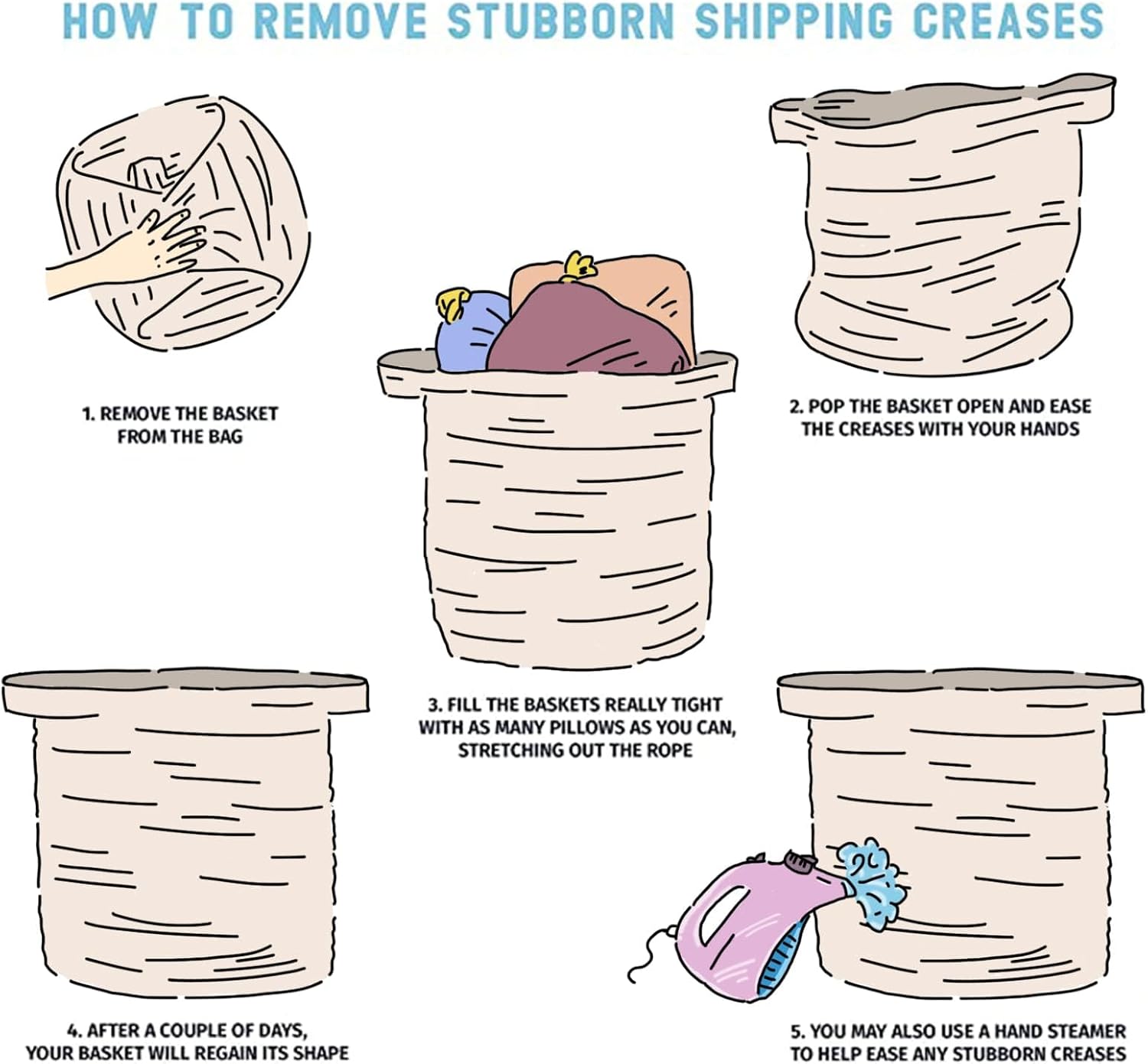 - Washable Large Basket: This large basket can be washed by hand or machine with gentle detergent. If machine washed, please put them into a laundry bag. NOTE: These cotton rope baskets are folded when shipping, but it will turn back to its elegant shape quickly if you fill it with some towels or clothing, and iron is great idea to remove the creases