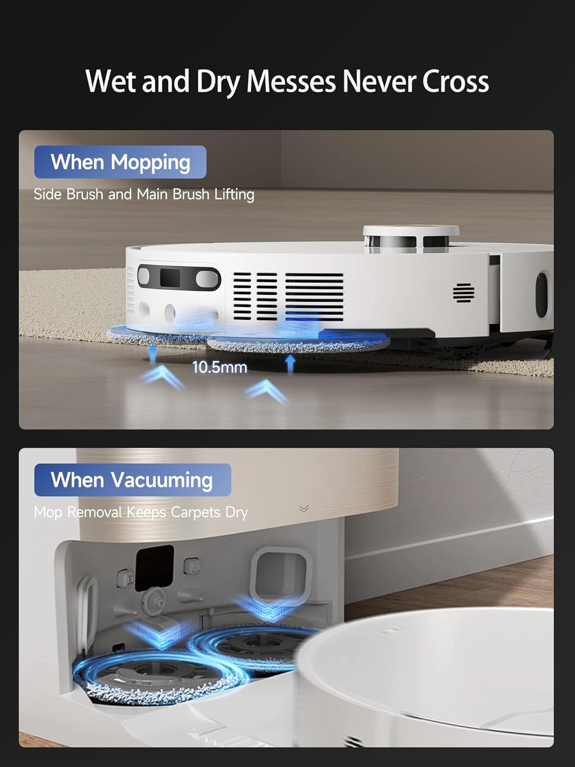 - Keep Carpets Dry with a Removable & Liftable Mop: X40 Ultra protects carpets from moisture by removing mops or auto-lifting them to 10.5mm(0.41inch). Set zones to avoid rugs, reducing the risk of getting stuck.