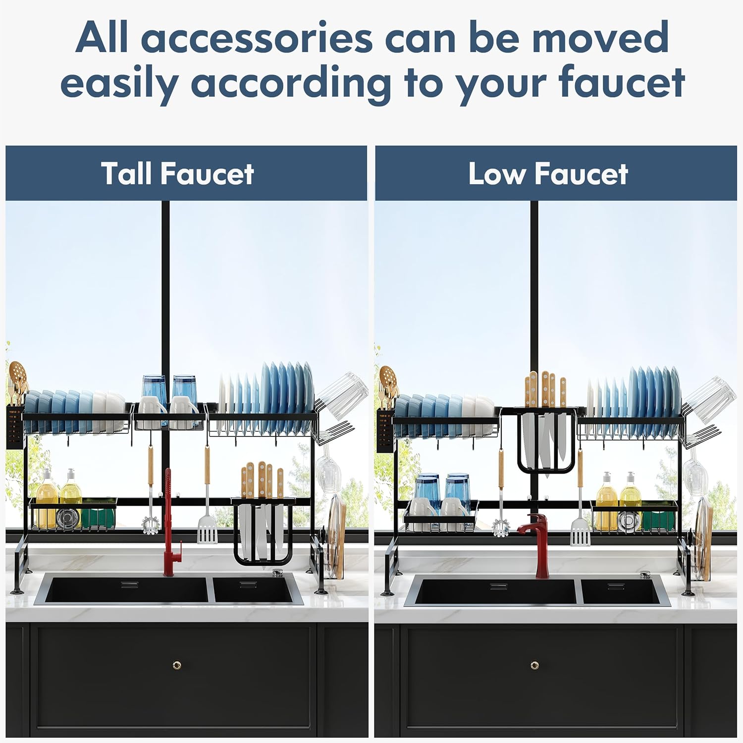 - 🔄 Expandable Design for Custom Fit: Adjust the over sink dish drying rack width effortlessly to span most standard single or double sinks, adapting seamlessly to your kitchen layout. The dish drain modular design allows rearranging tiers and accessories to prioritize space for tall glasses, wide pans, or cleaning tools, maximizing vertical storage above the sink