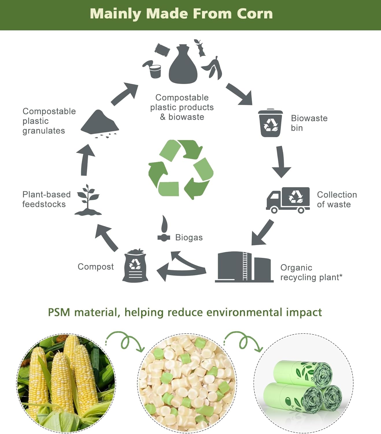 - 【Plastic & Odor Reduction, Living in Harmony with Nature】Degradable trash bags 8 gallon made with corn starch and recyle materials, meet the US ASTM D6866 standards, these 8 gallon trash bags unscented break down naturally to reduce plastic waste