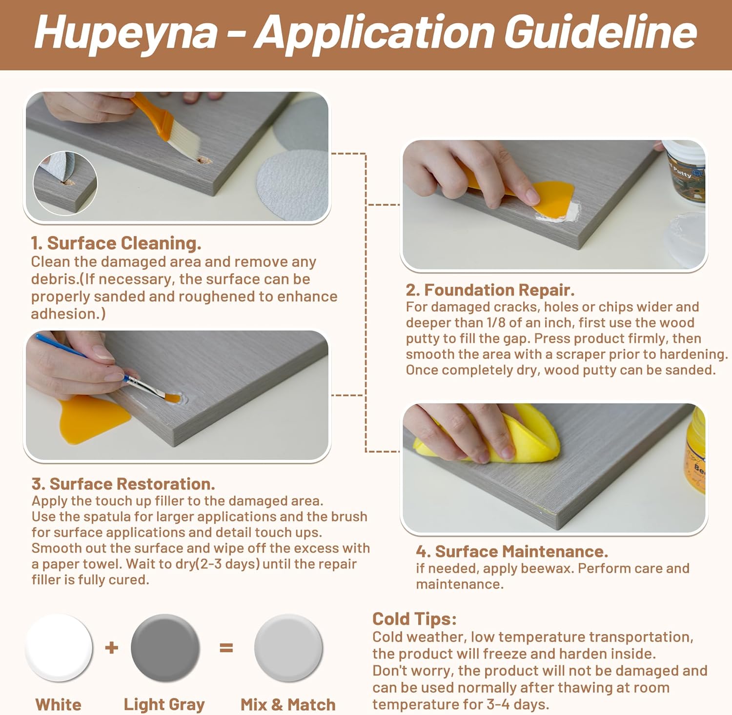 - Fully functional wood repair kit for wood furniture. Deep Repair (Wood Putty) Premium Hupeyna wood filler putty seamlessly fills deep scratches, dents and holes in wood furniture and flooring. Surface Coloring (Repair Hupeyna Wood Fillers) Newly upgraded large-capacity 4 colors to choose: white, black, light gray, wood white. Care and Maintenance (Wood Furniture Polish) Beewax Wood Furniture Polish can be used on both finished and unfinished wood surfaces.