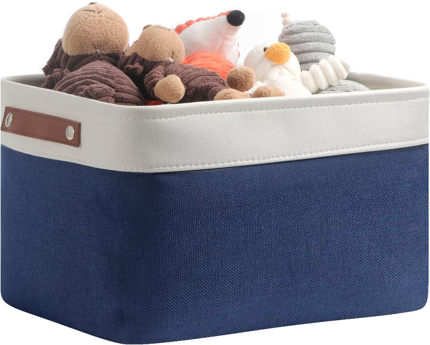 - 【PREMIUM MATERIAL】The medium storage basket is made with sturdy extra thick linen cationic fabric exterior and linen polyester interior lining. Strong upper metal keeps the shape and structural. The handles are made of premium quality leather and fixed on both sides of the basket by rivets.