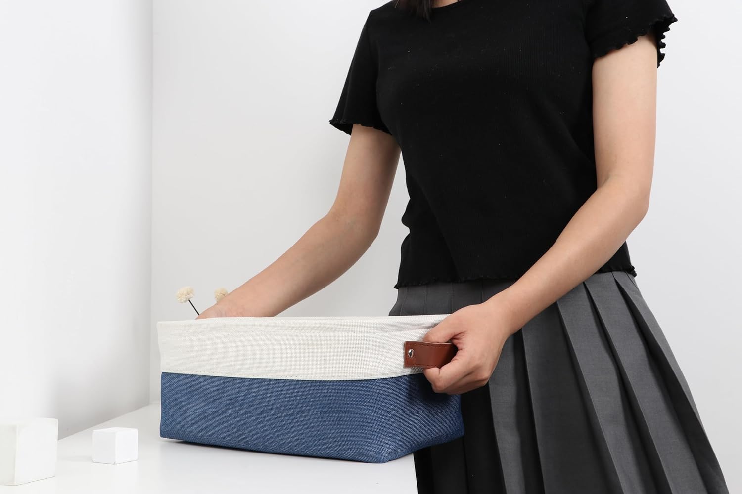 - 【EASY TO CARE】The small storage basket is sturdy and has no odor. Built to last these bins are reinforced with an O-ring on the top to give shape and structure so they are not machine washable. Due to lined with a thin linen fabric, they are easy to clean, just need to wipe with a damp sponge or cloth.