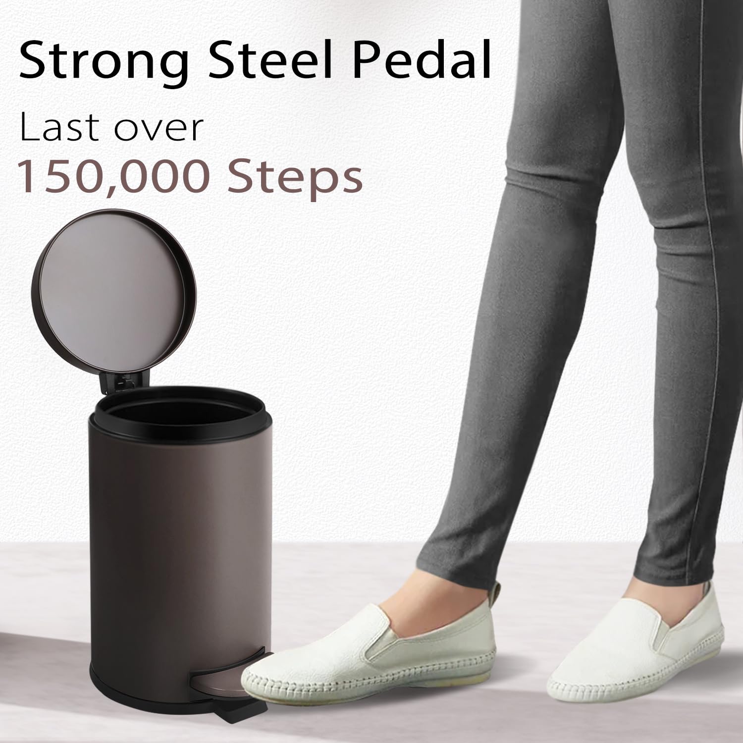 - Strong Steel Pedal: The pedal of the trash can is engineered to last over 150,000 steps — that's more than 20 steps a day for 20 year