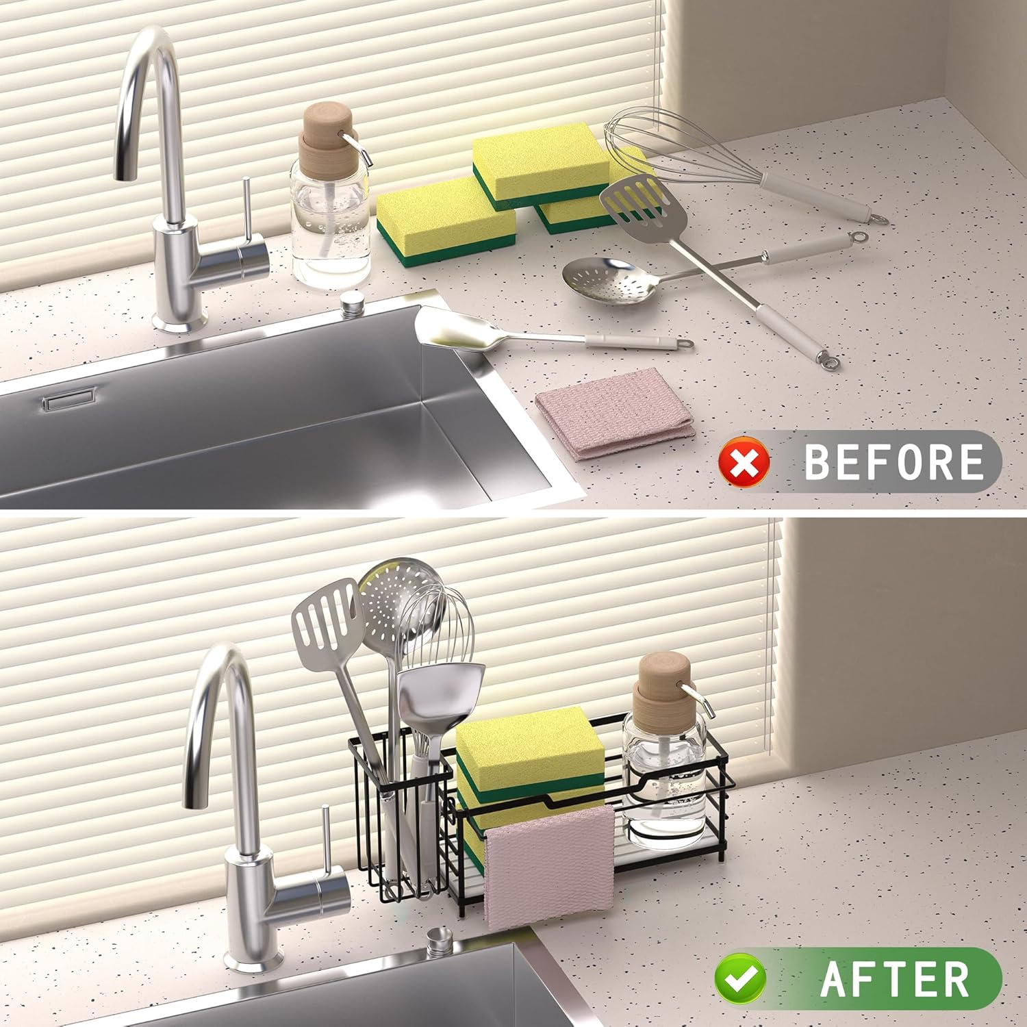 - Multi-Purpose Sink Organizer โ Holds soap, sponges, scrub brushes, dish soap, and towels neatly in one place. Ideal for kitchen sink organization or bathroom counter organization.