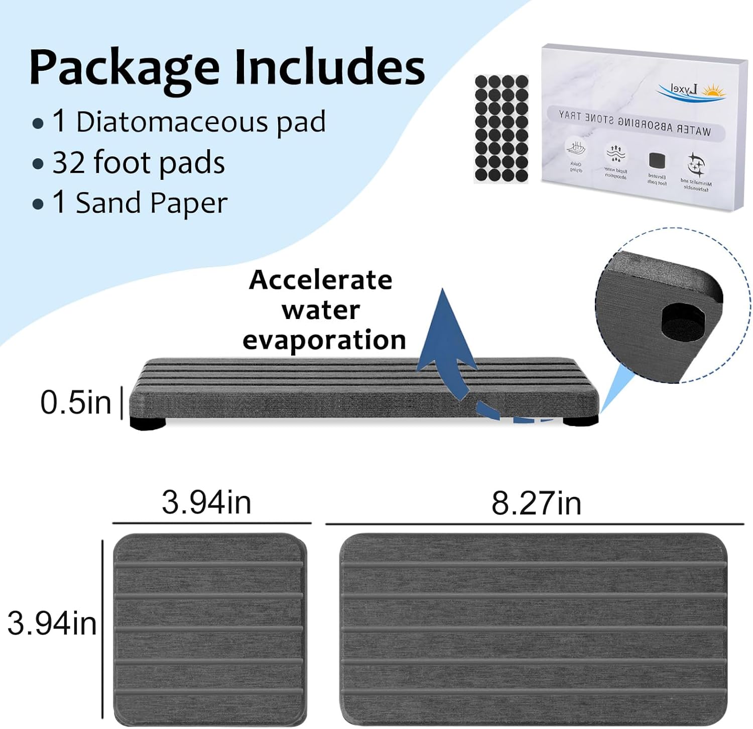 - More Anti Slip and Ventilated --- The silicone footpads boost the slip-resistance of stone drying tray while keeping them out of the bathroom vanity.This design improves the contact surface between fast drying stone sink tray and air, accelerates the evaporation of water,and extends the service life of the water absorbing stone tray for sink.