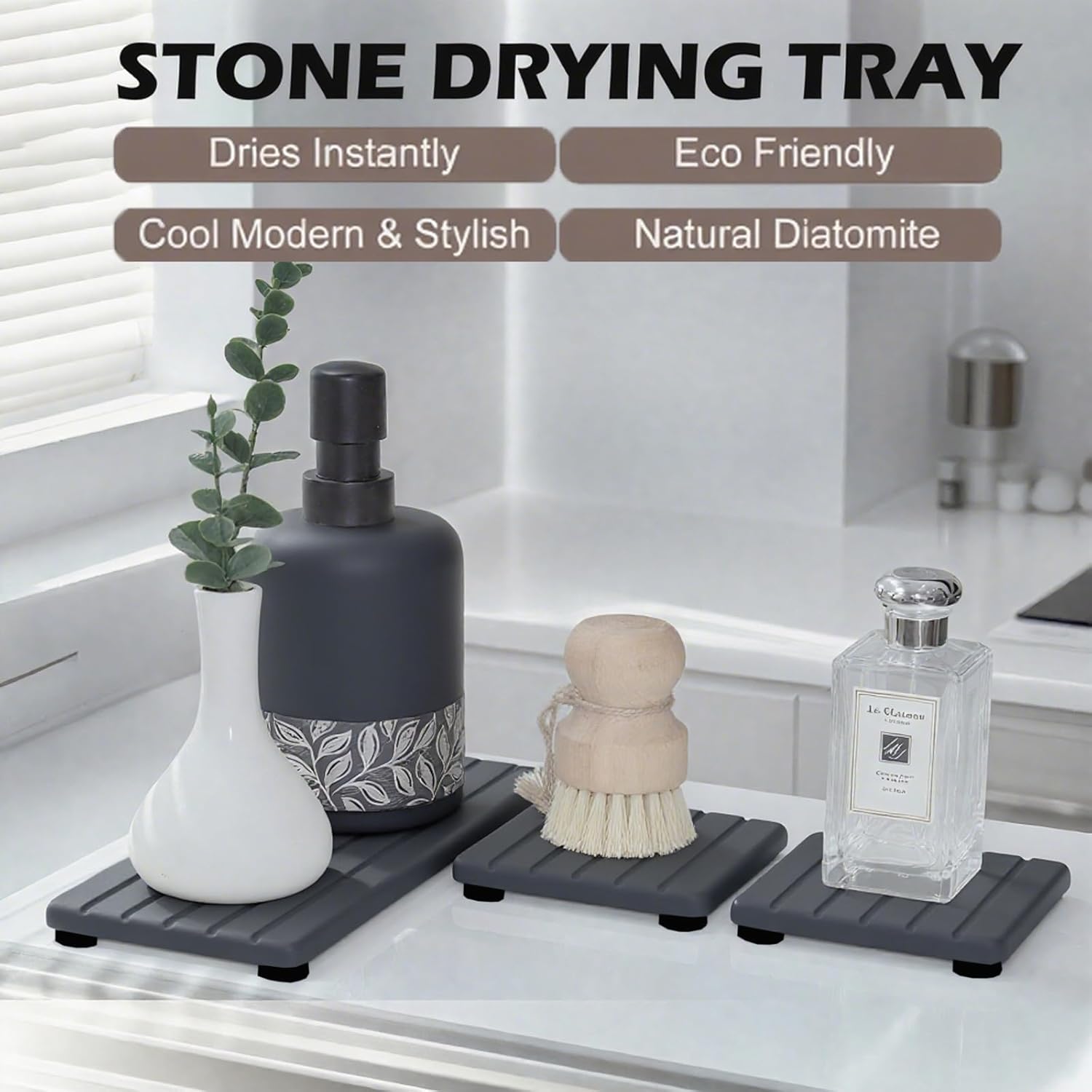 - Multi-use --- This water absorbing stone tray is suitable for bathroom sink, kitchen counter and other scenes. It can be used as soap/water cups/hand soap bottles/dishwashing sponges/make-up bottles etc absorbent pads; Use our absorbent stone trays to keep your sink / counter dry and clean, making life tidy and orderly.