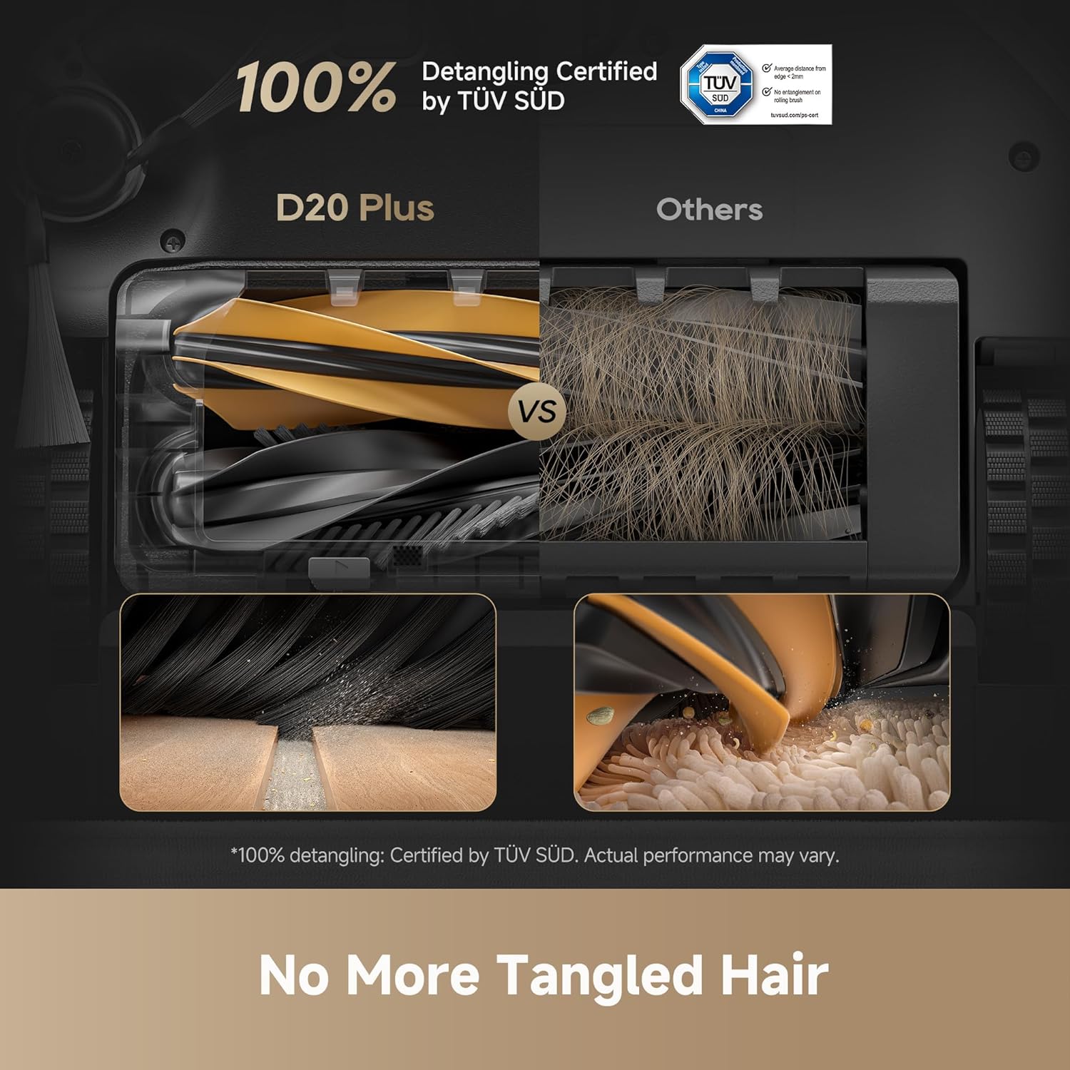 - 13,000Pa Suction + DuoBrush — Say Bye to Tangled Hair D20 Plus comes with 13,000Pa Vormax suction (yeah, that’s super strong), and its anti-tangle DuoBrush grabs long hair and pet fur like a pro—no more messy rollers to clean.