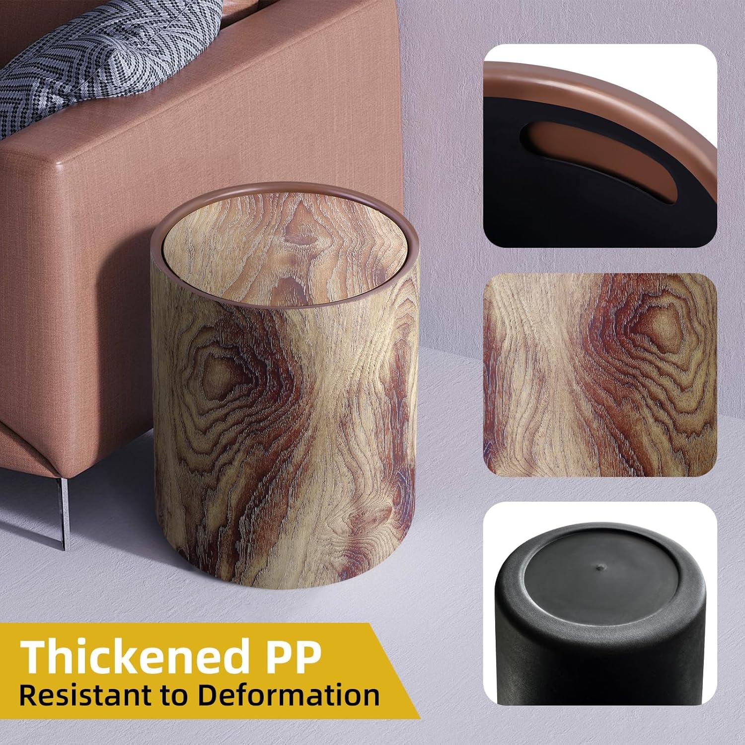 Wood Grain Plastic Trash Can Swing Top Lid, 4Gal/15L Farmhouse Wastebasket Bin Retro Style with Inner Bucket, Bathroom Trash Can Hidden Bag for Room Aesthetic, Round Brown Garbage Can 2pack