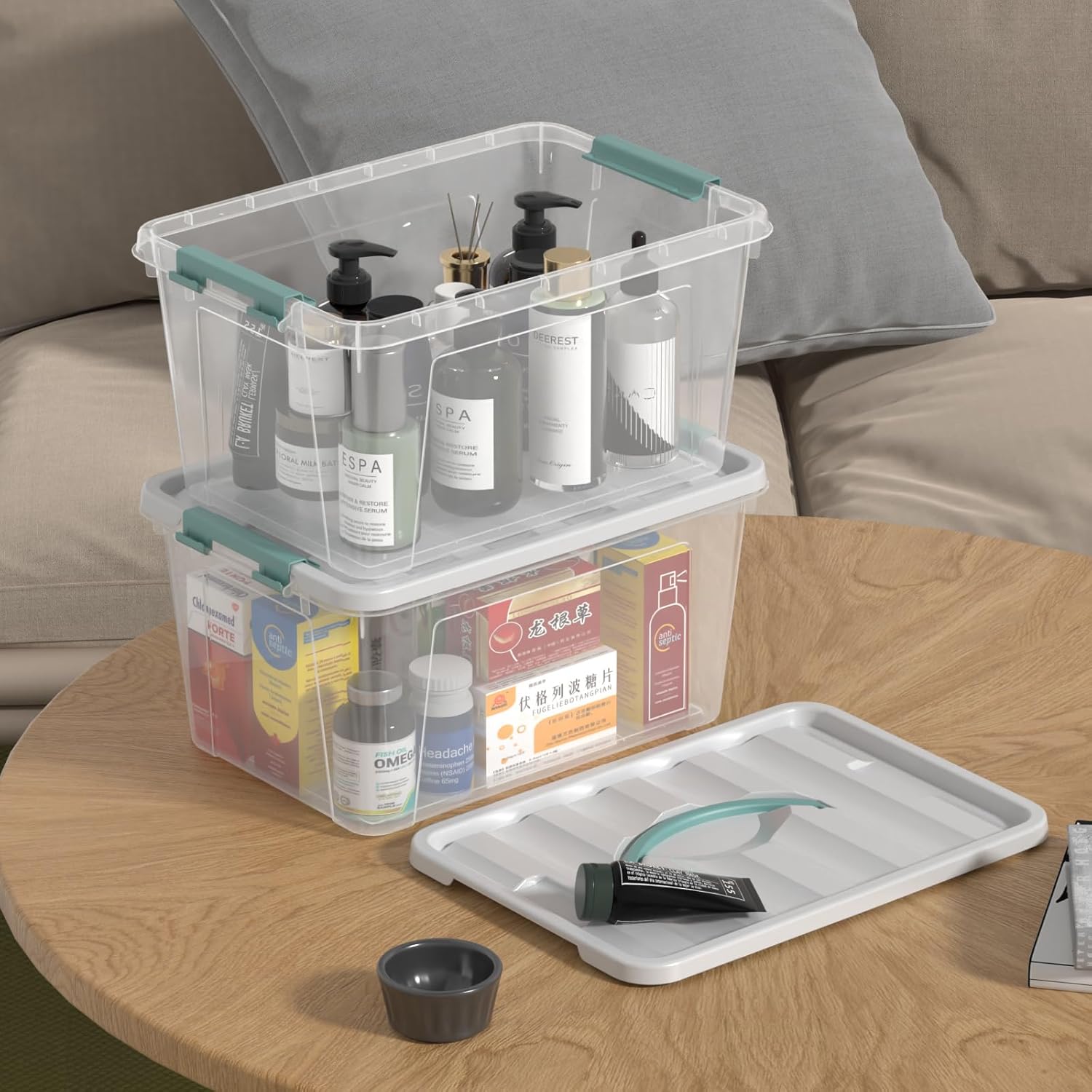 - Equipped with sturdy storage buckles that latch onto the lid, these plastic clear latches box offer superior containment. Your contents are safeguarded from dust, liquid, and other unwanted elements once the lids are securely fastened. Additionally, the lid's green handle allows for easy and convenient lifting of the storage lidded box