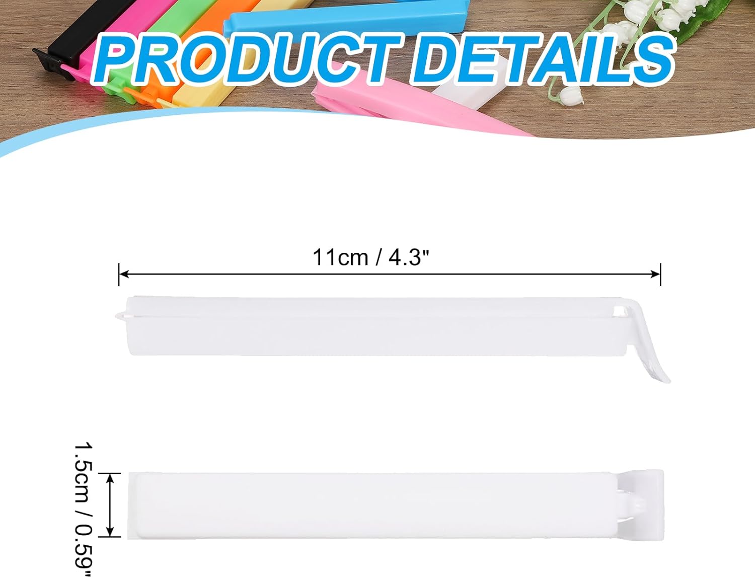 - Material: PP;Color: White;Maximum Clamping Width: 9 cm / 3.5 inch;Overall Size: 11 x 1.5 cm/4.3 x 0.6 inch(L*W);Package List: 10Pcs x Food Clips for Bags.