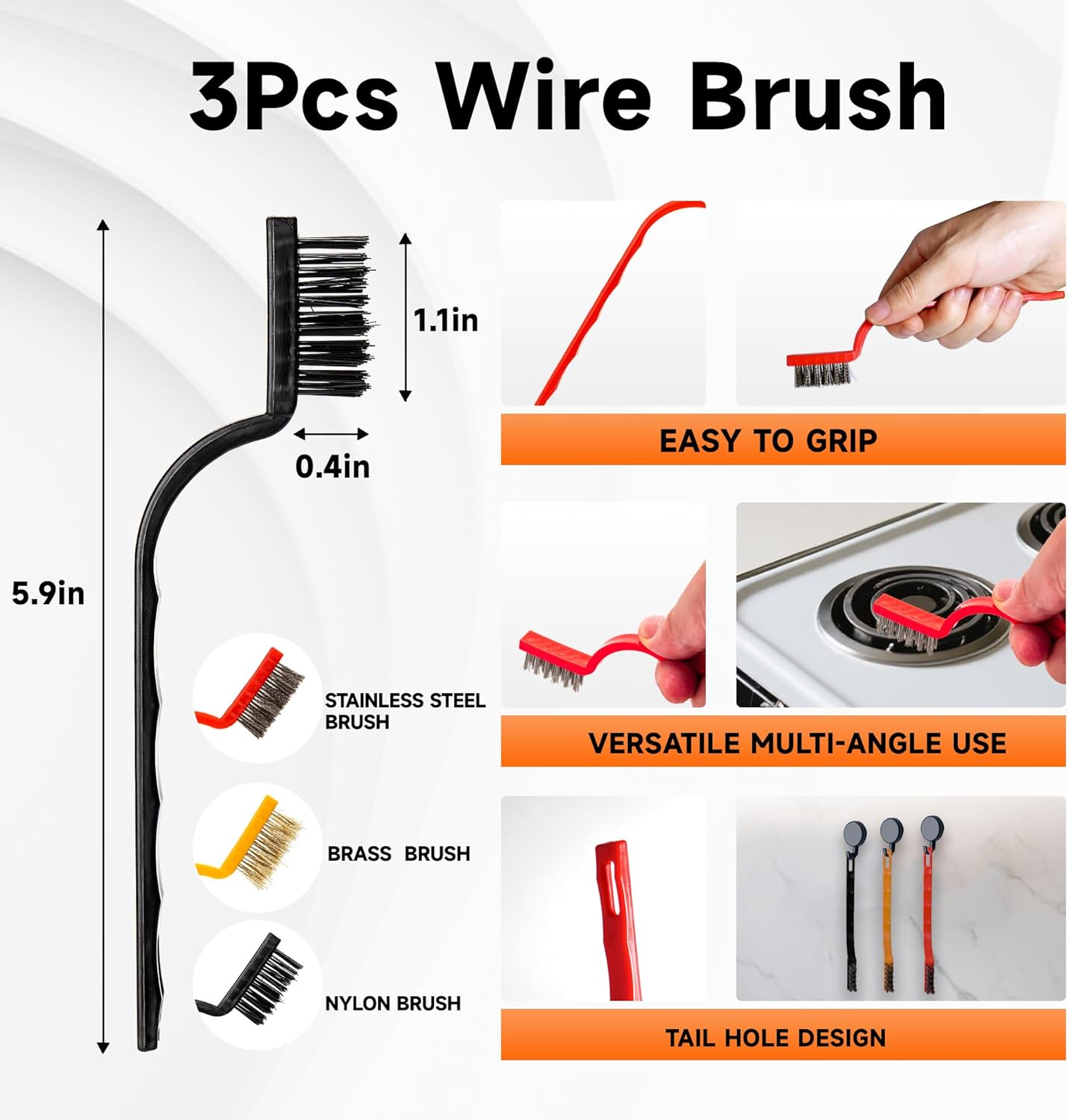 - 【3Pack Wire Brush】 Our versatile wire brush set includes three brushes:stainless steel for rust and tough stains, brass for scratch-free metal surfaces, and gentle nylon for delicate areas. Crafted from high-quality materials, these brushes deliver reliable, durable performance that lasts.Designed for ease of use, the ergonomic handles provide comfort during extended cleaning tasks, while the compact size of the brushes makes them perfect for tight spaces. With a convenient tail hook for easy storage, this all-in-one solution is ideal for the kitchen, bathroom, garage, or workshop.