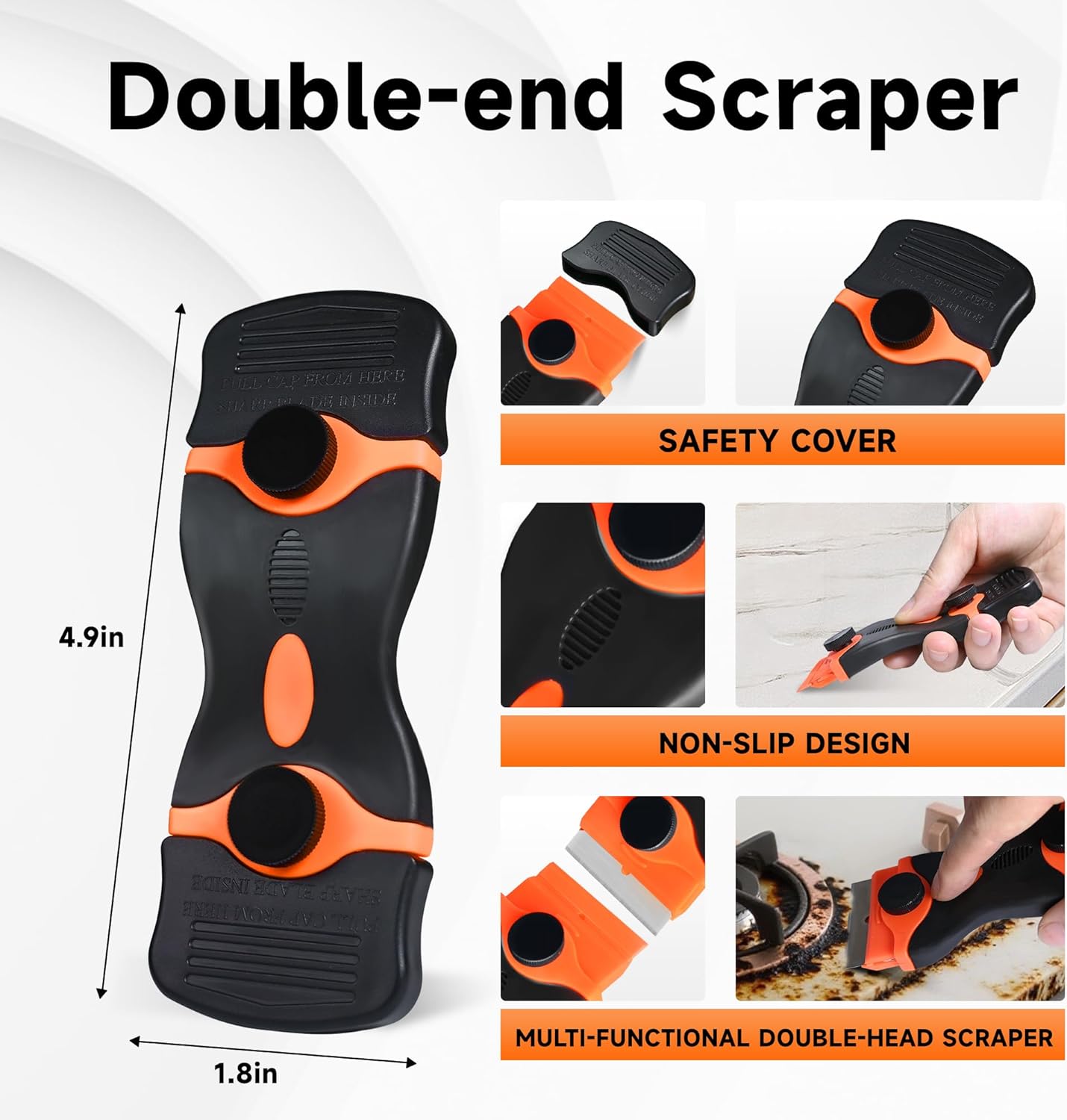 - 【Proven Double-edged Plastic Scraper】 Experience effortless cleaning with our double-end plastic razor blades, designed for versatility in various cleaning tasks. .Compact and easy to grip, our ergonomic paint scraper features a soft rubber handle for comfort and control. The heavy-duty non-slip TPR handle ensures durability and a cushioned grip, while the double-secure safety cap protects against accidental cuts. Plus, the screw lock keeps the blade stable during use, saving you time and effort.