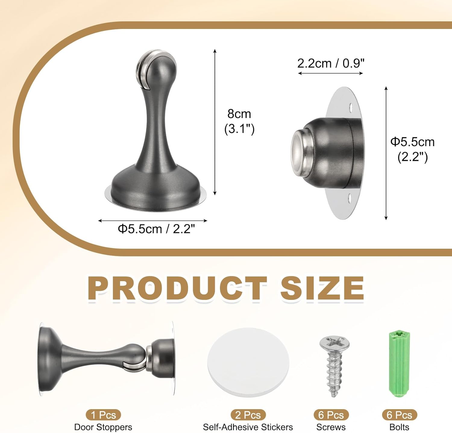 - Package contains 1pcs x Door Stoppers, 6pcs x Screws, 6pcs x Bolts, 2pcs x Self-Adhesive Stickers. Mounting Plate Size: 5.5 x 2.2 cm / 2.2 x 0.9 inch (Dia*H), Base Size: 5.5 x 1 cm / 2.2 x 0.4 inch (Dia*H), Total Height: 8 cm / 3.1 inch