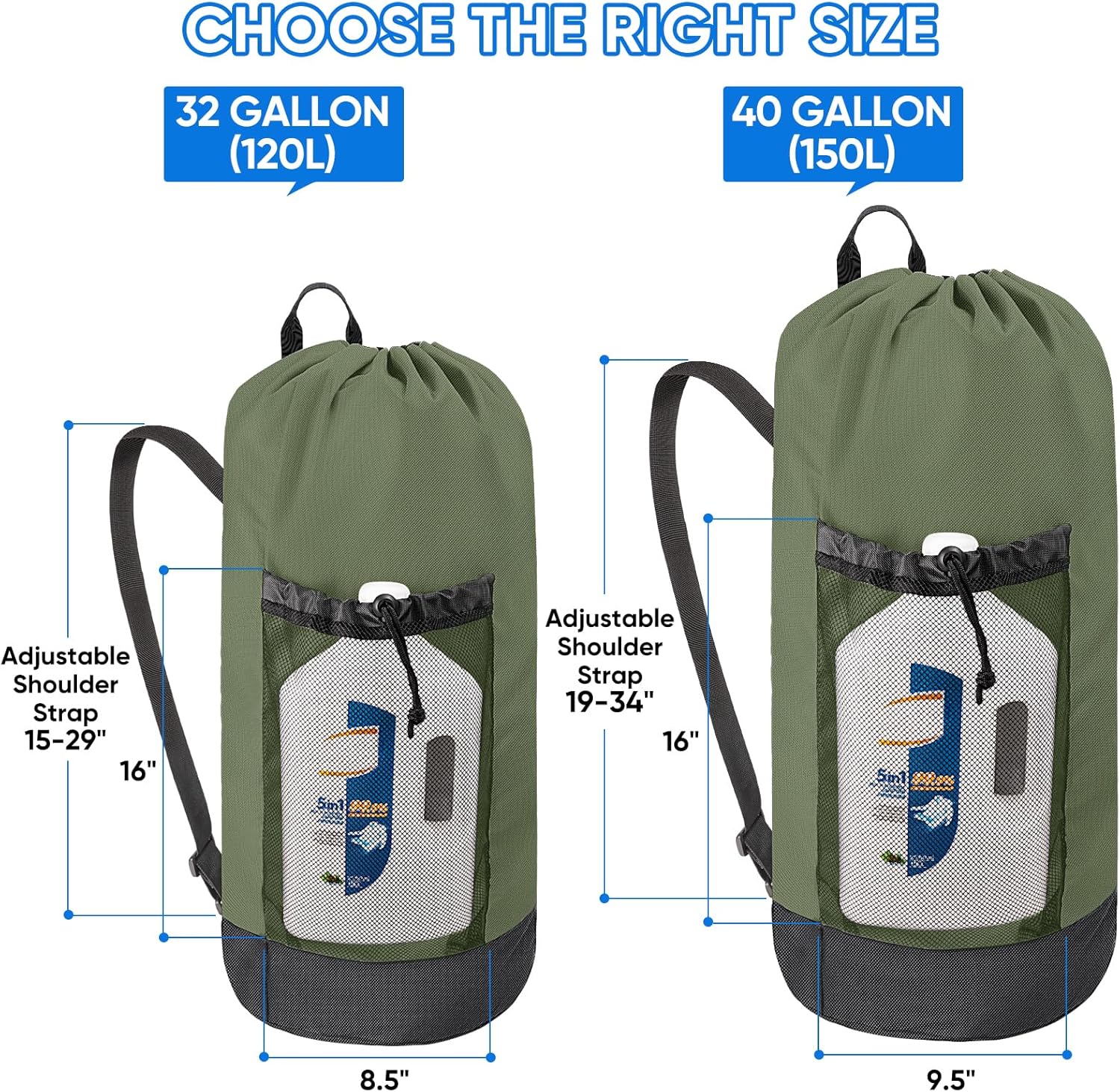 - 120L Large Laundry Bag: These travel laundry bags measure 29 "H X 13 "L with a large capacity of up to 120 L, enough for holding 2-3 batches of clothes; They also feature two front mesh wash pockets (16 "H X 8.5"L each), making your laundry backpack have space for storing detergent, shoes, and other essentials