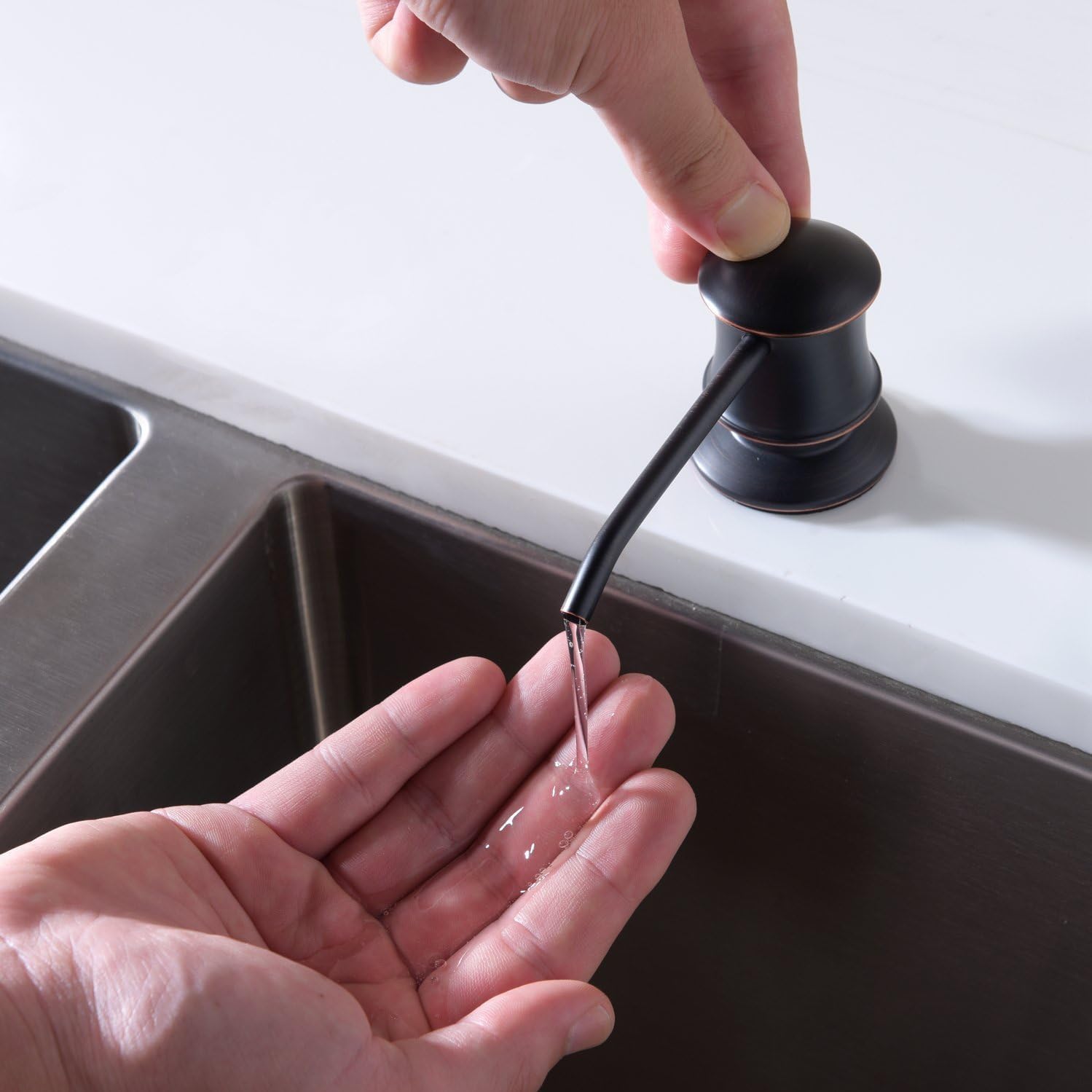 - The built-in design makes your kitchen countertop look clean and tidy,The classical shape paired with the oil-rubbed bronze color creates a high end aesthetic combination.Pls note:first pump takes about 50 presses, but there’s a hose piece that keeps soap from sliding back into the container. So you’ll never have to do that again.
