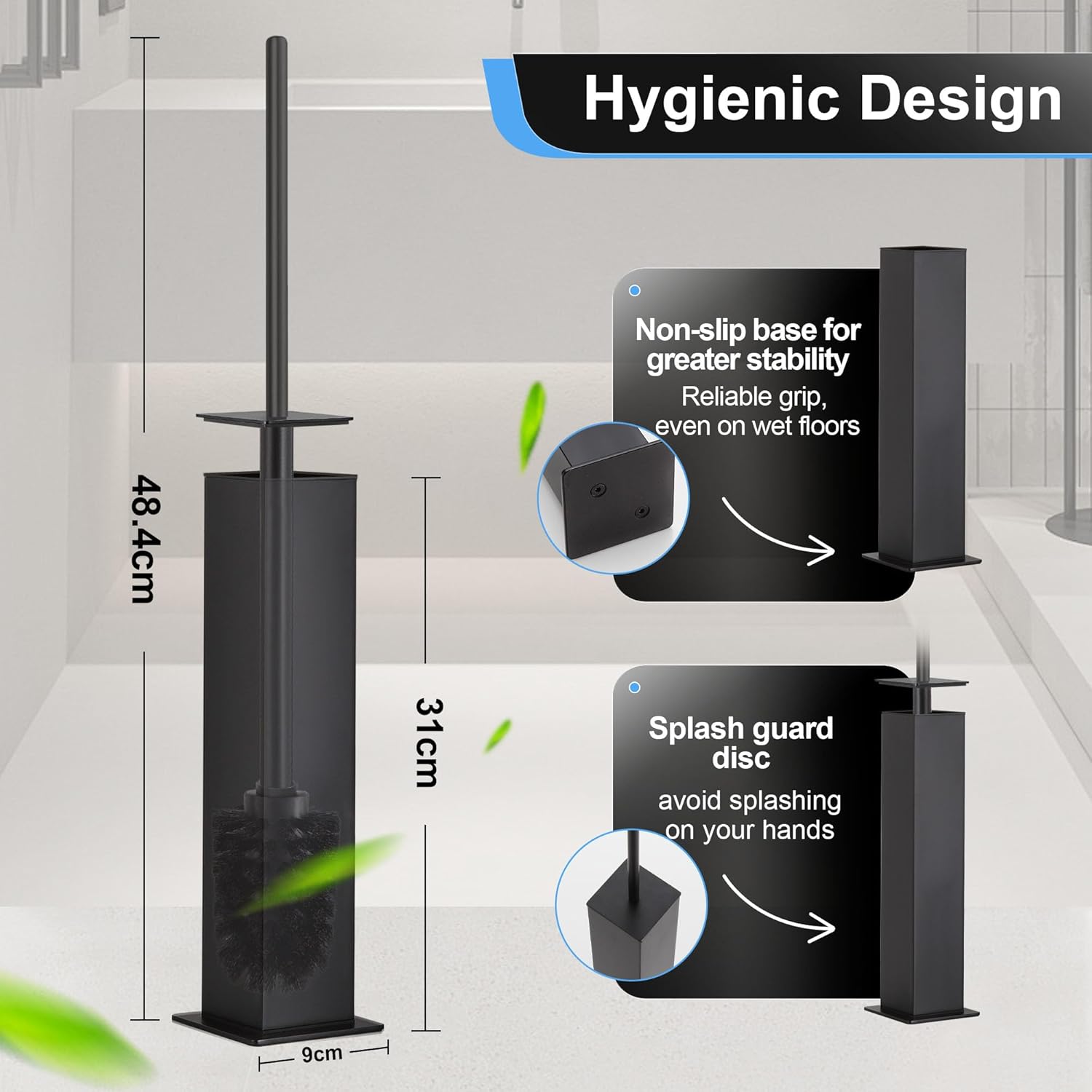 - Wide Non-Slip Base for Stable Free-Standing Design – This free-standing toilet brush features an enlarged footprint with rubber anti-skid pads, anchoring securely on tile or vinyl floors without tipping or sliding—no mounting or added weight required.