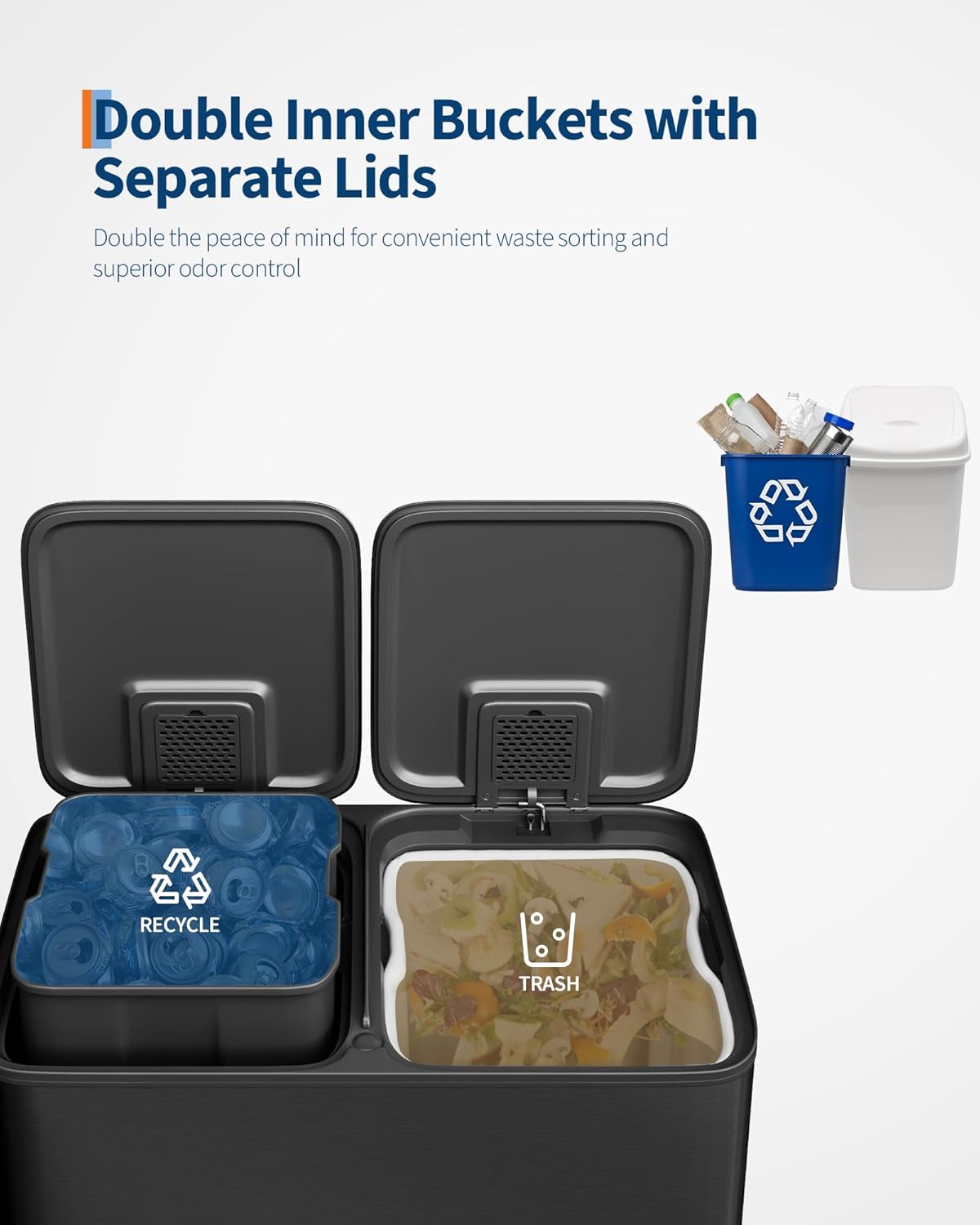 GarveeHome 2 x 10.6 gal Stainless Steel Double Trash Can with Lid for Kitchen, Large Dual Trash and Recycle Bin Combo, Step-on Kitchen Metal Garbage Cans, PP Inner Buckets, Liner Rim, Matte Black