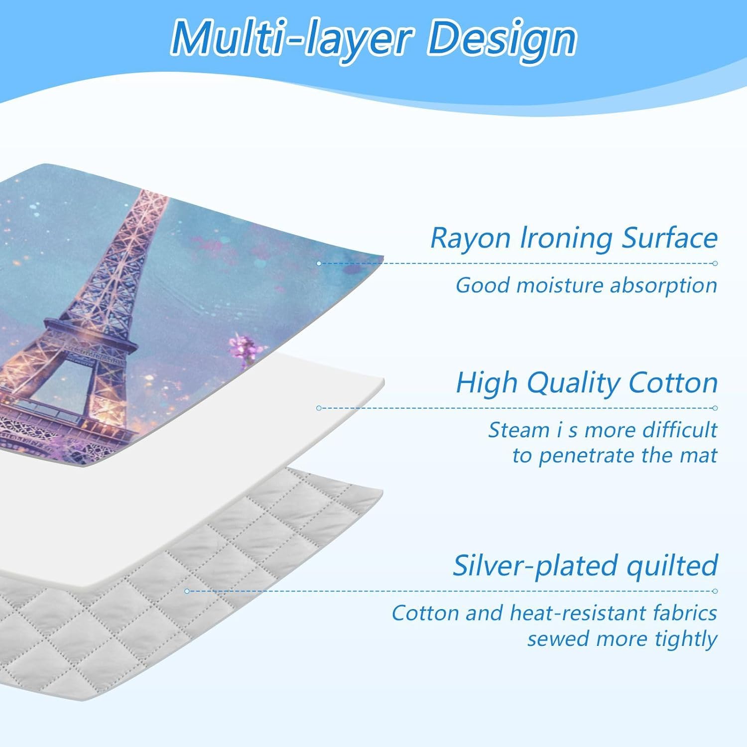- Material: Our ironing mat for table top has 3 layers, rayon ironing surface + high quality cotton + silver-plated quilted fabric, making it durable to use