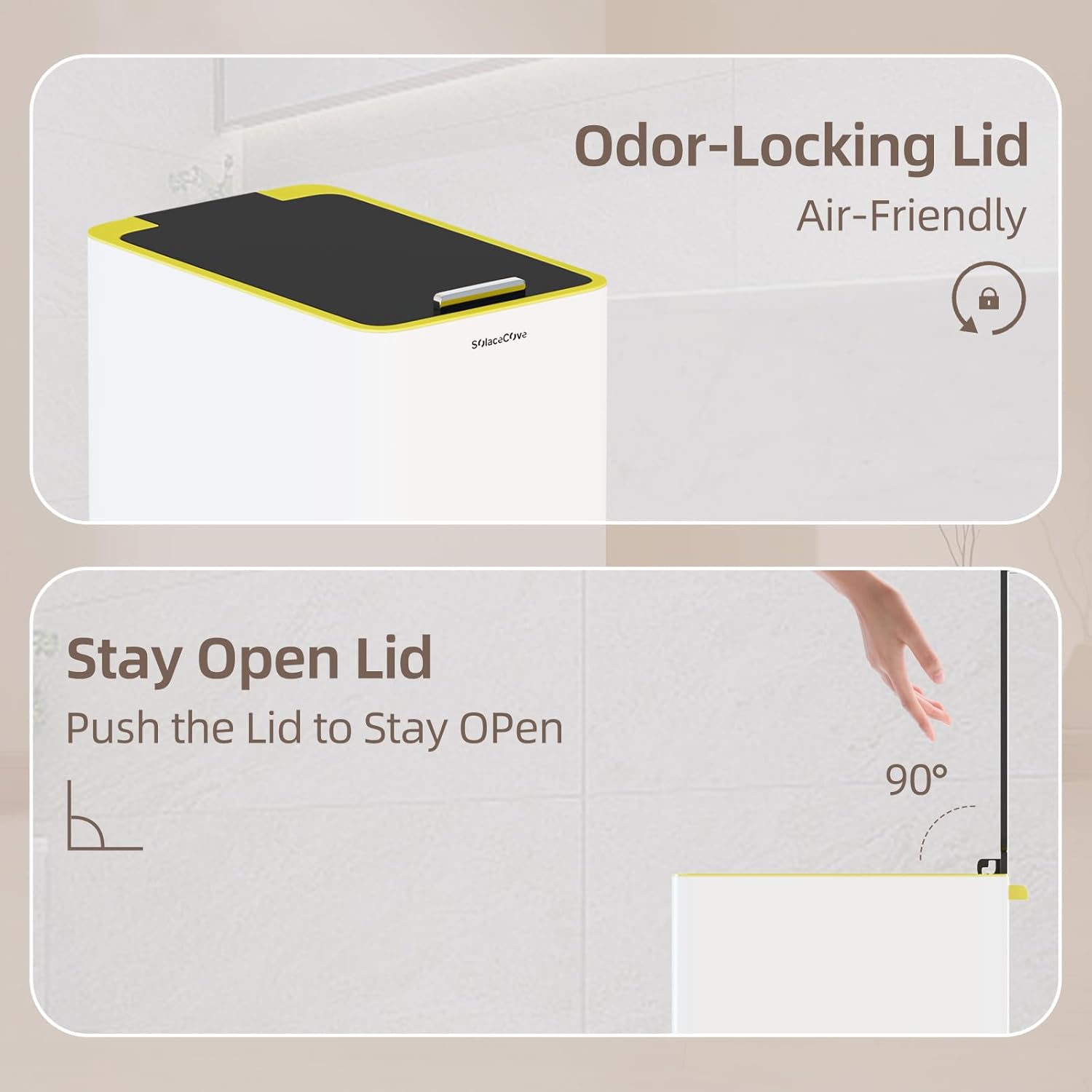 - Soft Close & Stay Open Lid:The 4 gallon trash can is made of a stay open function and pushes the lid at 90° when release the pedal.The lid can be closed quietly without causing noise interference to others