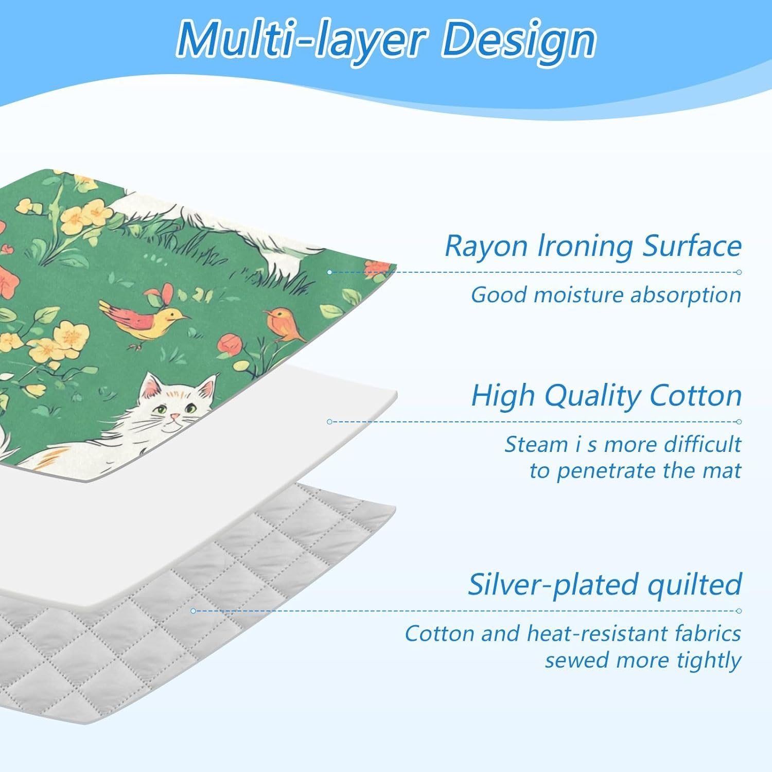 - Material: Our ironing mat for table top has 3 layers, rayon ironing surface + high quality cotton + silver-plated quilted fabric, making it durable to use
