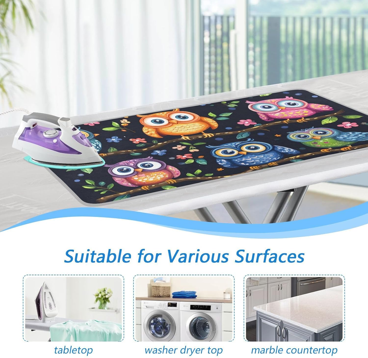 - Double-Side Use: Our ironing pad mat is one-side printed with multiple patterns, but it can be used on both sides. Our ironing board mat comes with a silicone ironing rest pad and can protect your countertop effectively, it’s a reliable and easy tool to store your hot iron freely on table, countertop or storage area. Our ironing pad is the perfect replacement for a heavy-duty, full-size ironing board