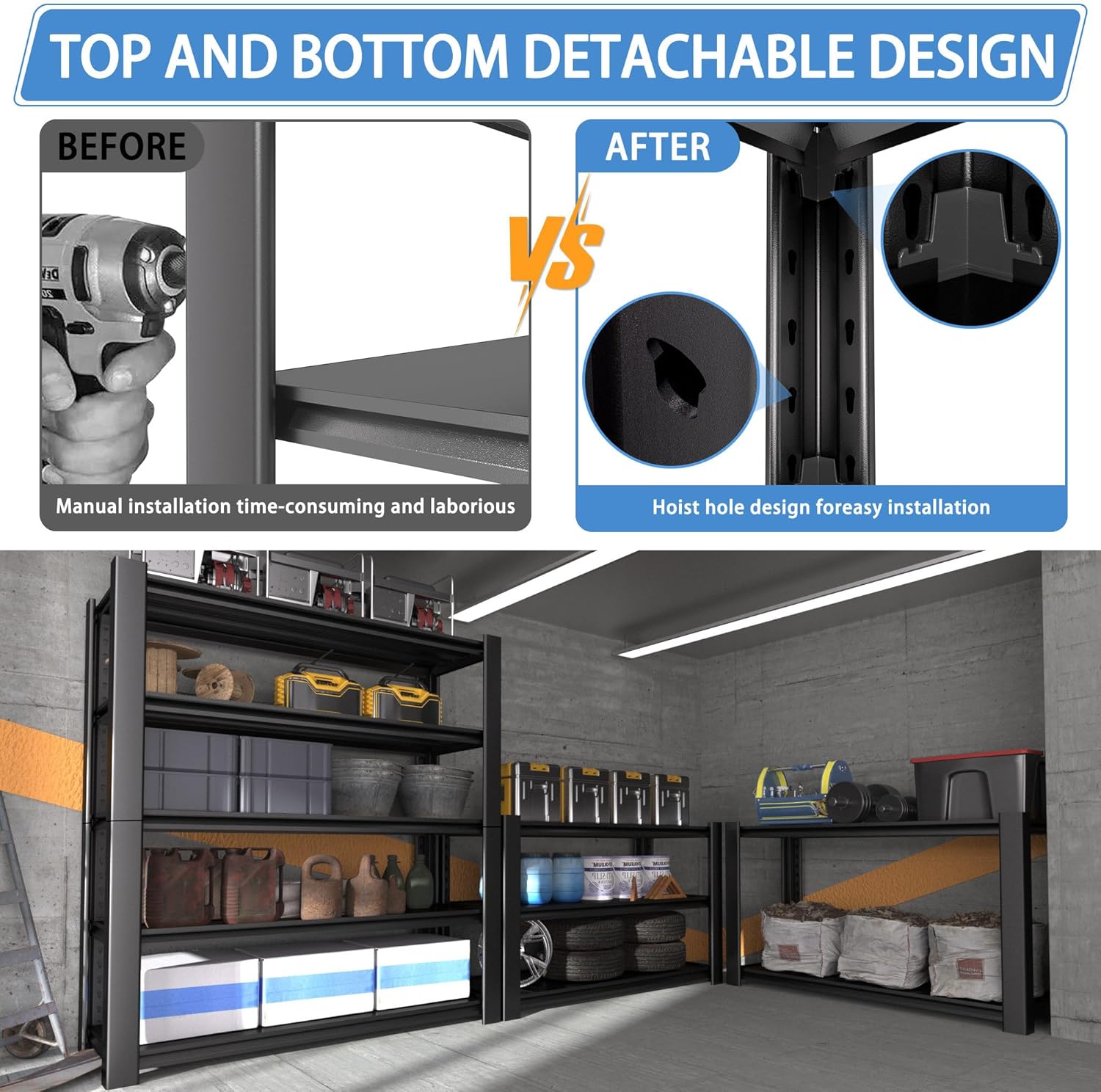 - Heavy-Duty Steel Construction & High Capacity: Built with industrial-grade metal, the NEXVRTAU shelving unit supports extreme loads on each of its 5 tiers. The heavy-duty steel frame and reinforced beams provide stable storage for tools, equipment, and bins โ perfect for garages, warehouses, or any space demanding reliable strength.