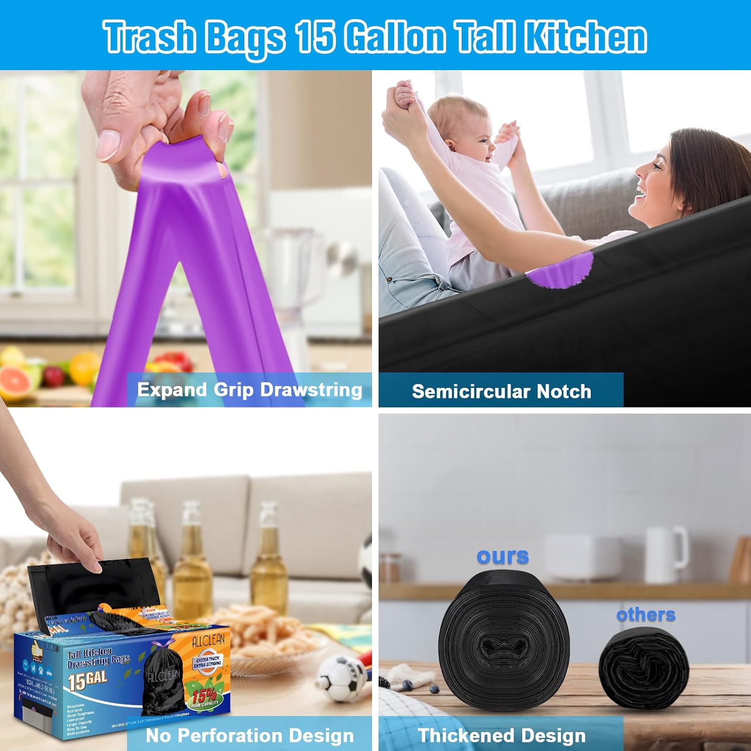 - [NO ANNOYING SLIDE&Thick Drawstring Design]: Our kitchen garbage bags are independent, with no need to break. For reducing stink and easy carrying, the 13-15 gallon tall kitchen garbage bags are designed with two-layer durable and thick drawstring handles. It makes our bathroom trash bags easy to tie up and throw out. The convenient drawstring handles are for easy lifting and ensure the bags stay in right place.