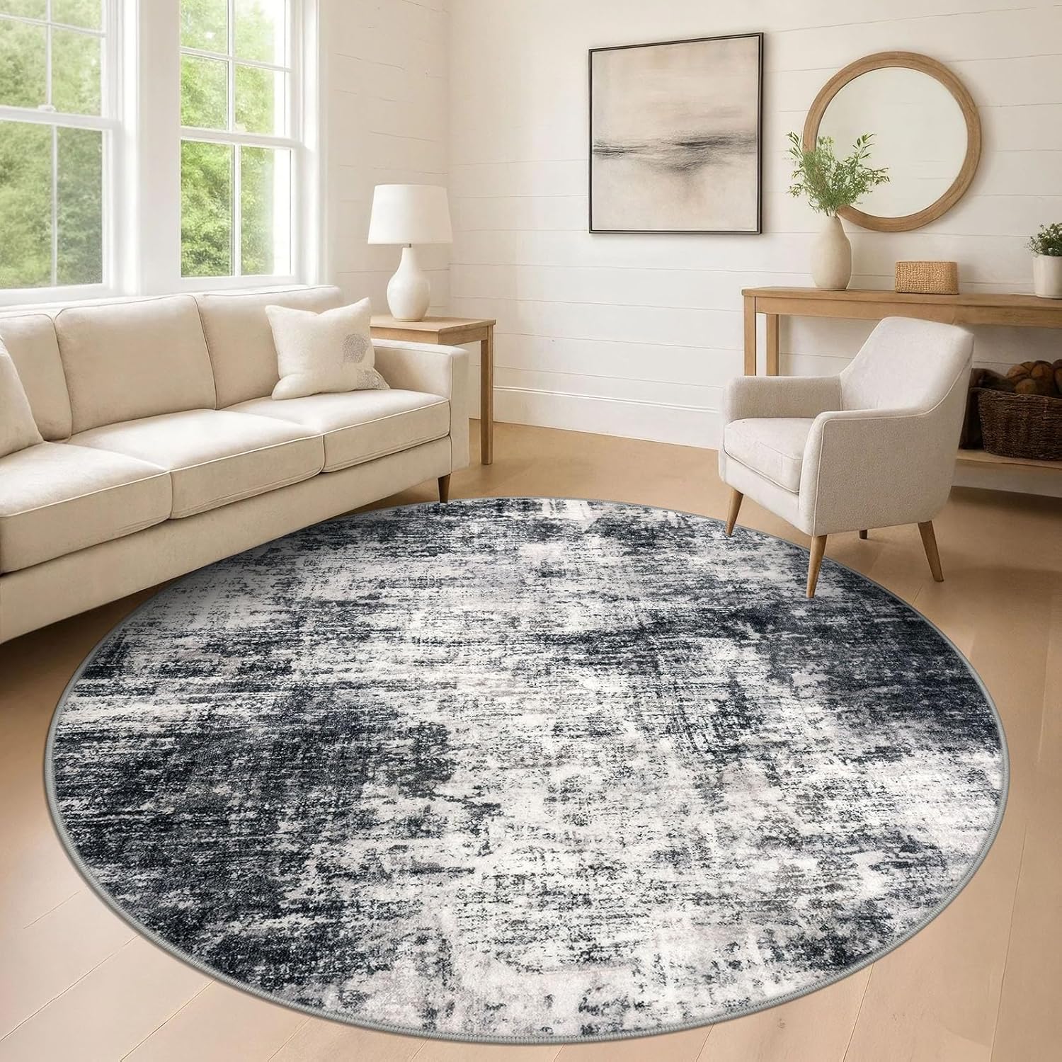 - Ultra Soft Touch: This washable round rug is made from plush synthetic fibers, offers a dense, cloud-like surface that cushions feet and shields toes from cold floors. Durable, non-shedding, fade-resistant, and odorless, it's ideal for high-traffic areas