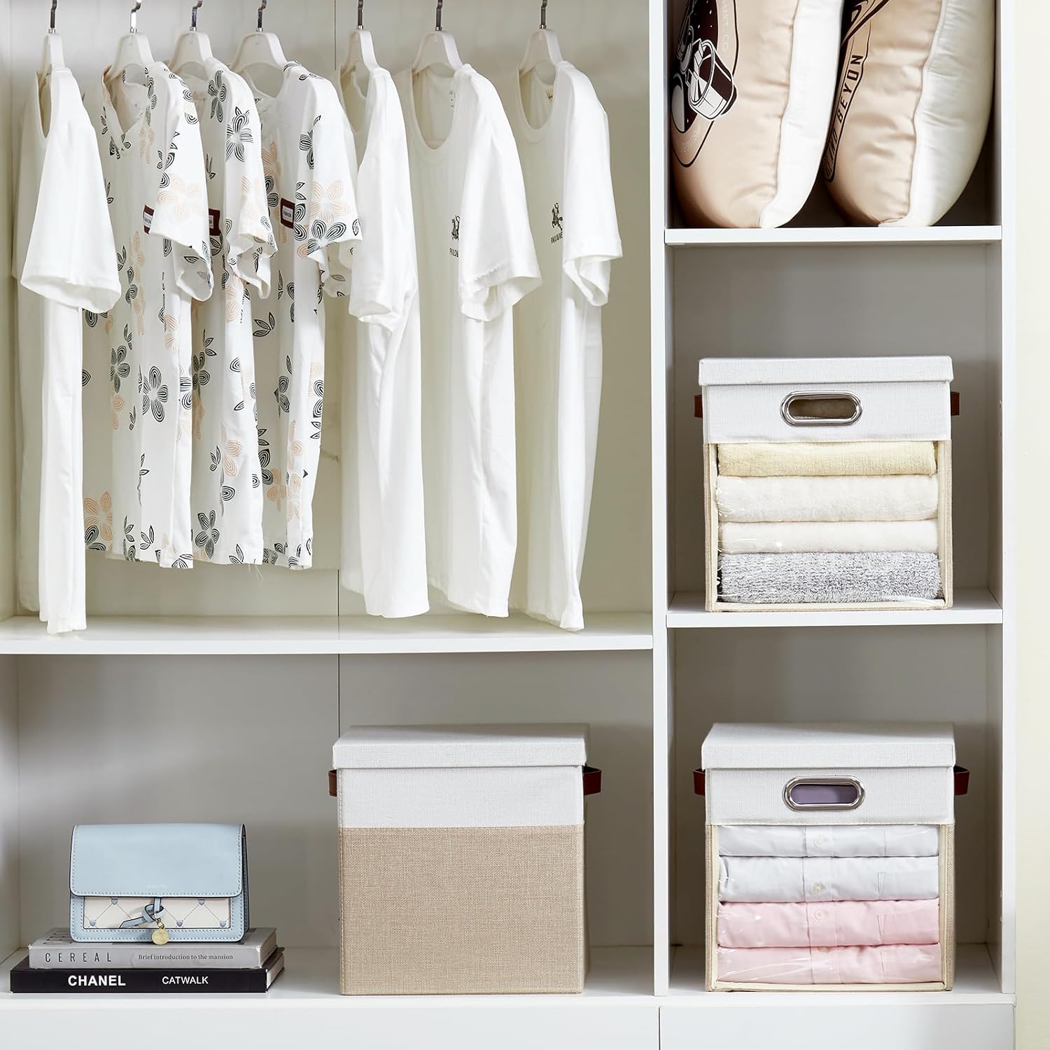 - Foldable Design: Roobyl linen closet organizers and storage features a foldable design that allows the box to be folded and placed in a closet or mezzanine when not in use, perfect for storage when changing seasons. Portable clear storage cube saves space in a closet or a mezzanine, maximizing the use of space, and the non-removable cardboard is designed to be more convenient, avoiding the loss of the box when not in use due to the removal of the cardboard and separation from the organizer.