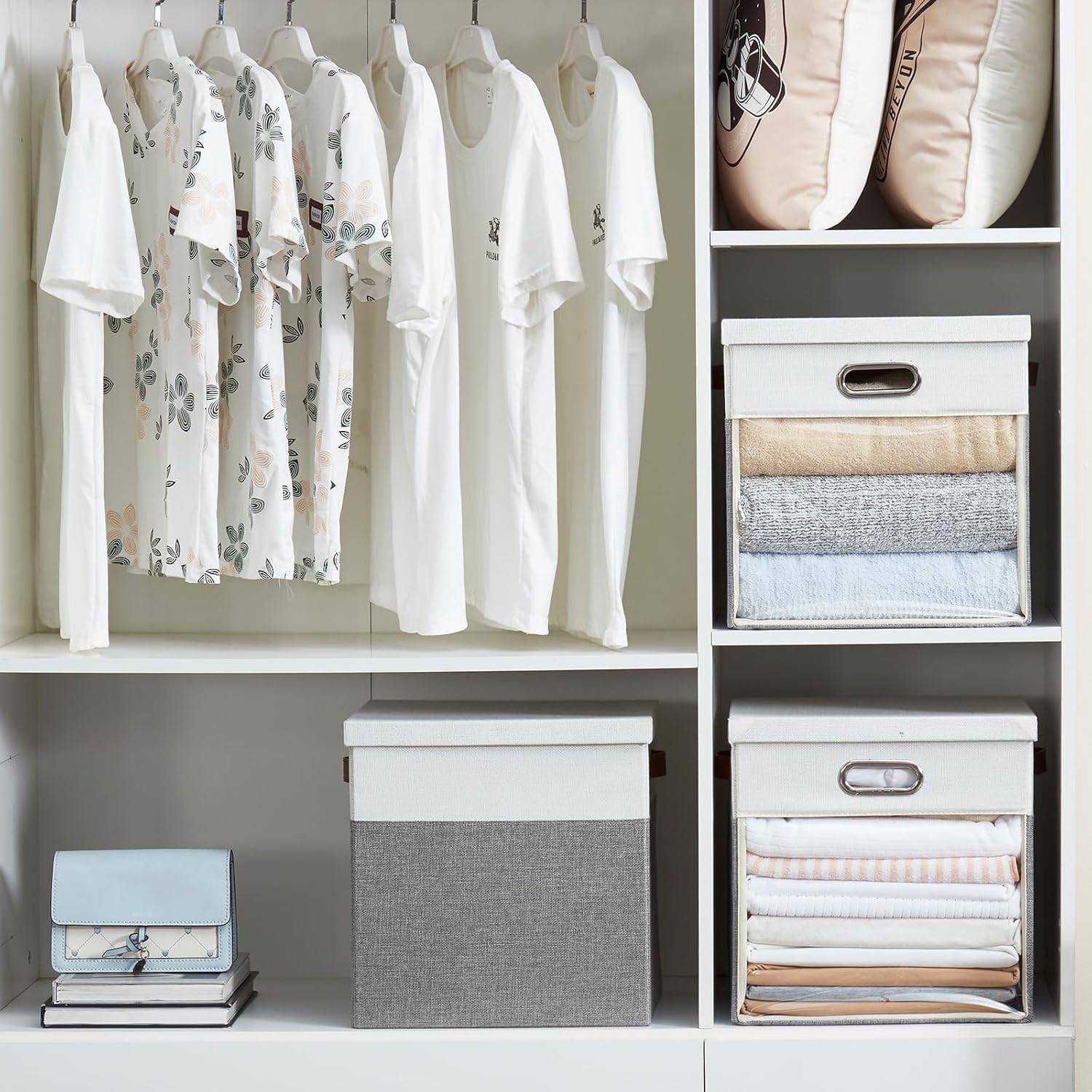 - Foldable design: Roobyl linen closet organizers and storage features a foldable design that allows the box to be folded and placed in a closet or mezzanine when not in use, perfect for storage when changing seasons. Portable clear storage cube saves space in a closet or a mezzanine, maximizing the use of space, and the non-removable cardboard is designed to be more convenient, avoiding the loss of the box when not in use due to the removal of the cardboard and separation from the organizer.