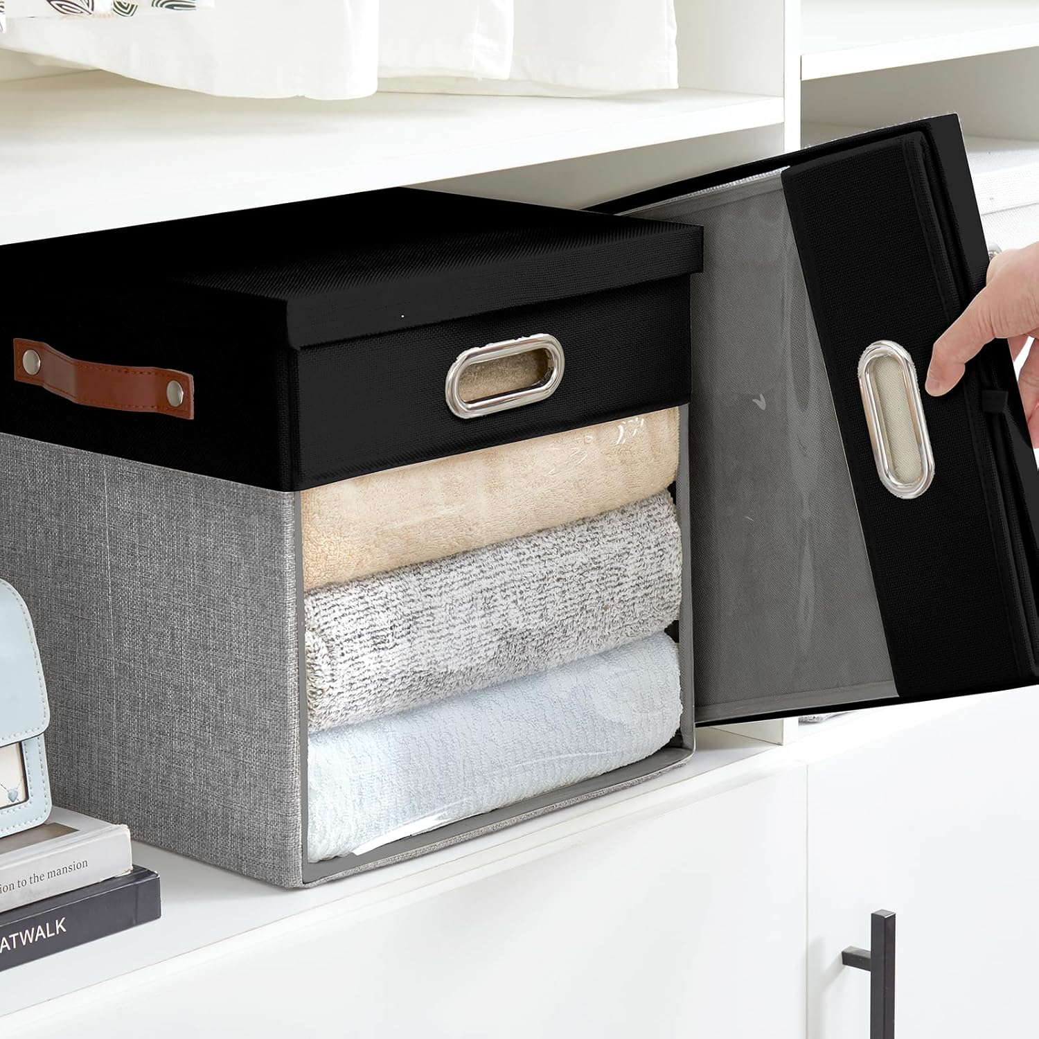 - Foldable design: Roobyl linen closet organizers and storage features a foldable design that allows the box to be folded and placed in a closet or mezzanine when not in use, perfect for storage when changing seasons. Portable clear storage cube saves space in a closet or a mezzanine, maximizing the use of space, and the non-removable cardboard is designed to be more convenient, avoiding the loss of the box when not in use due to the removal of the cardboard and separation from the organizer.