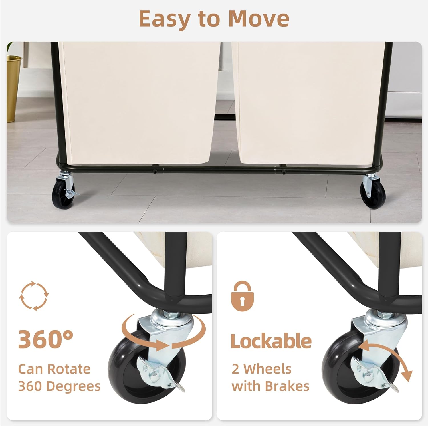 STORAGE MANIAC Commercial Laundry Hamper with Heavy Duty Steel Frame, 74 Gal. Industrial Laundry Basket Cart with Wheels for Hotel, Home, Laundry Room, Big Large Clothes Sorter, 2 Section Beige