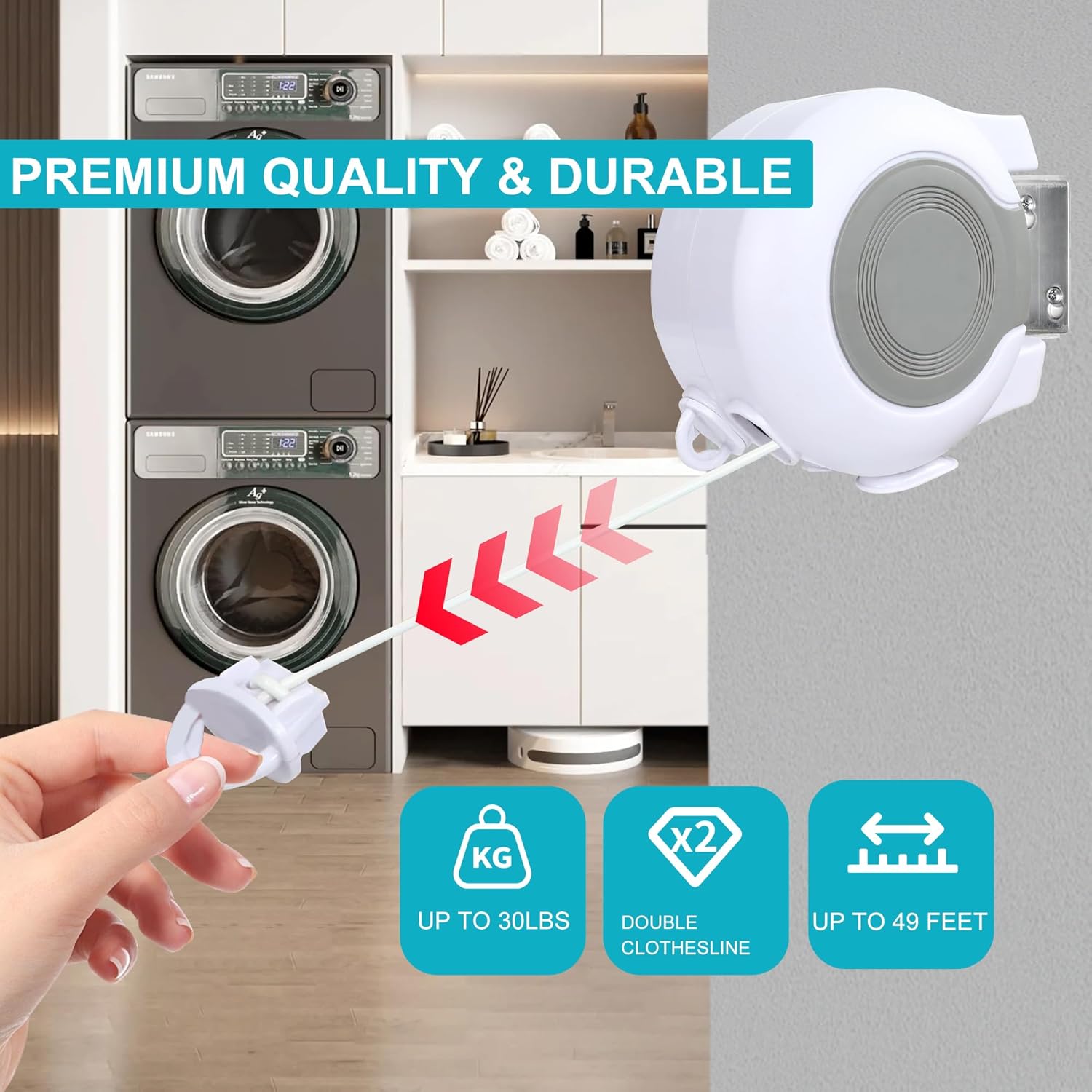 - PREMIMUM QUALITY: This rugged 30lb retractable clothesline comes fully assembled with ABS case that laughs at sun, rain, and drops – just mount it anywhere in seconds, stretch its 49ft muscle to hang king-size comforters or 20 soaking towels