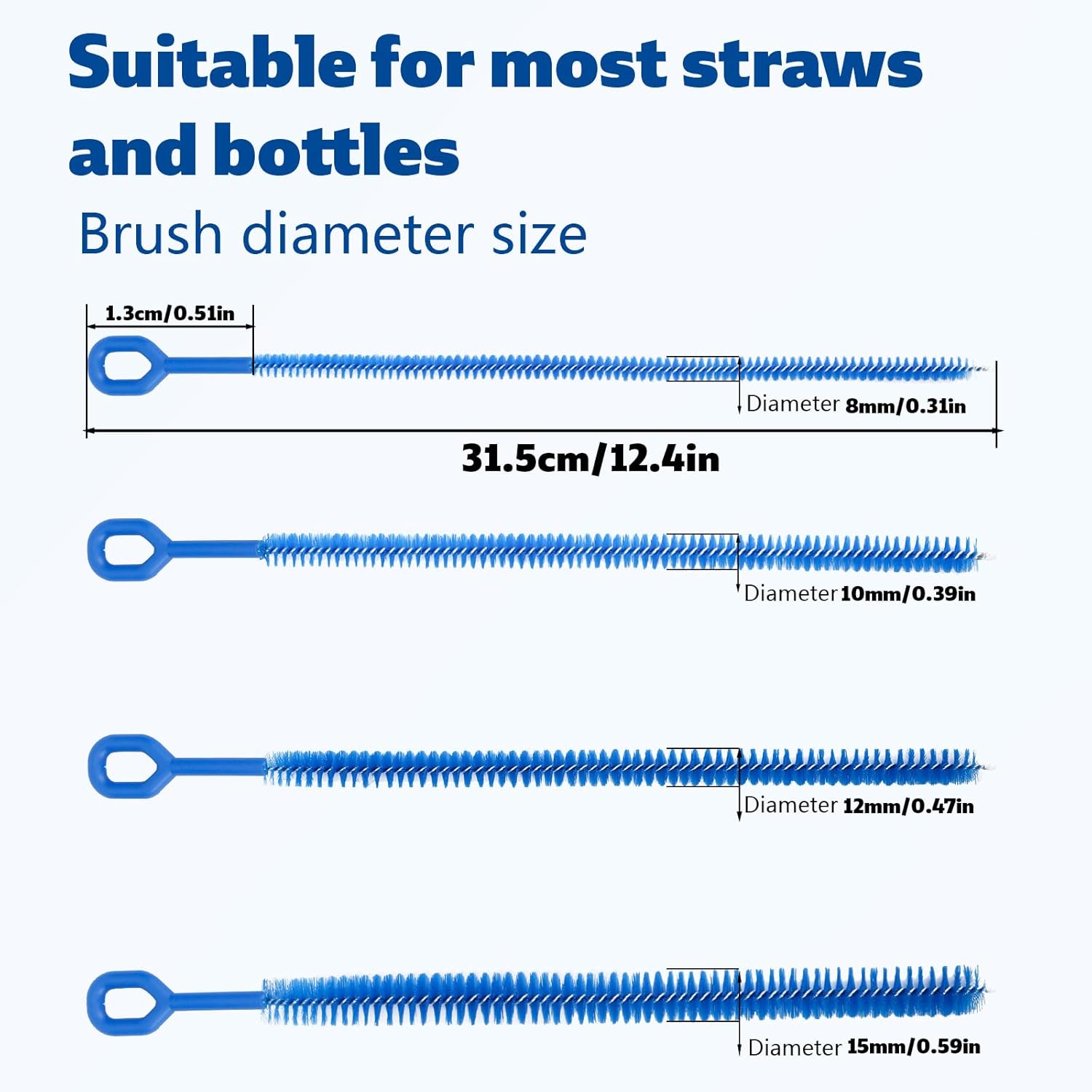 - 4 Sizes: The straw cleaning brushes measure about 31.5cm/12.4in in total length, and the brush diameter has 4 sizes, namely 8mm/0.31in, 10mm/0.39in, 12mm/0.47in, 15mm/0.59in, lightweight and easy to carry.
