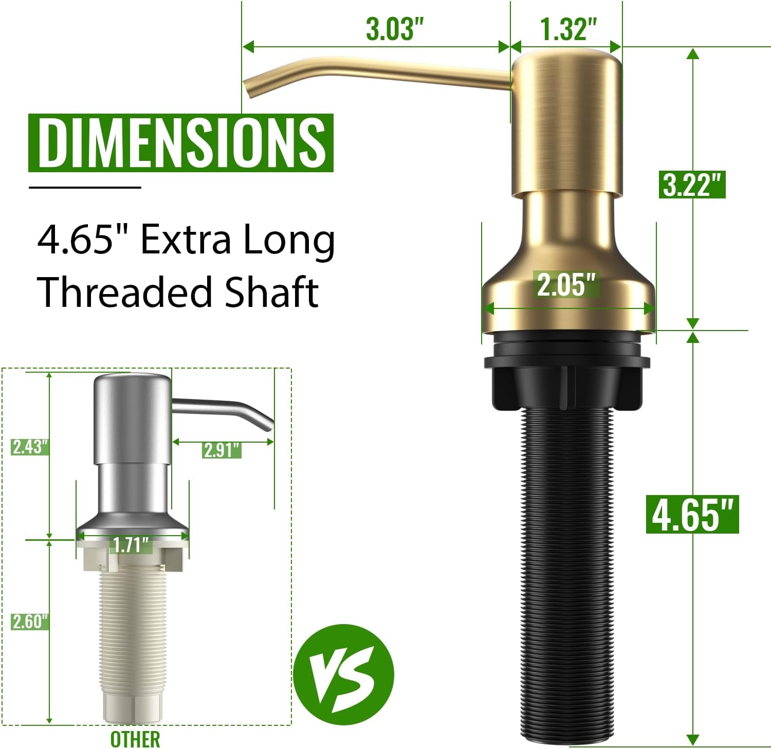 - Extra Long Threaded shank shaft:4.65 " threaded shank of soap dispenser can pass through most of deep countertops, like marble, stainless steel, wood or grantie. So it can also be used as a bathroom countertop soap dispensers. No worry about the thickness of your kitchen countertop.
