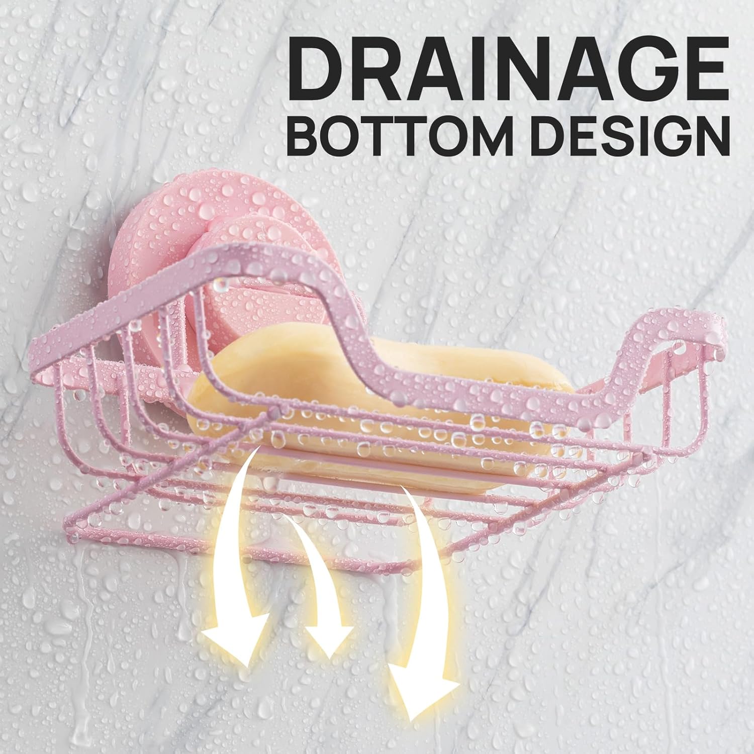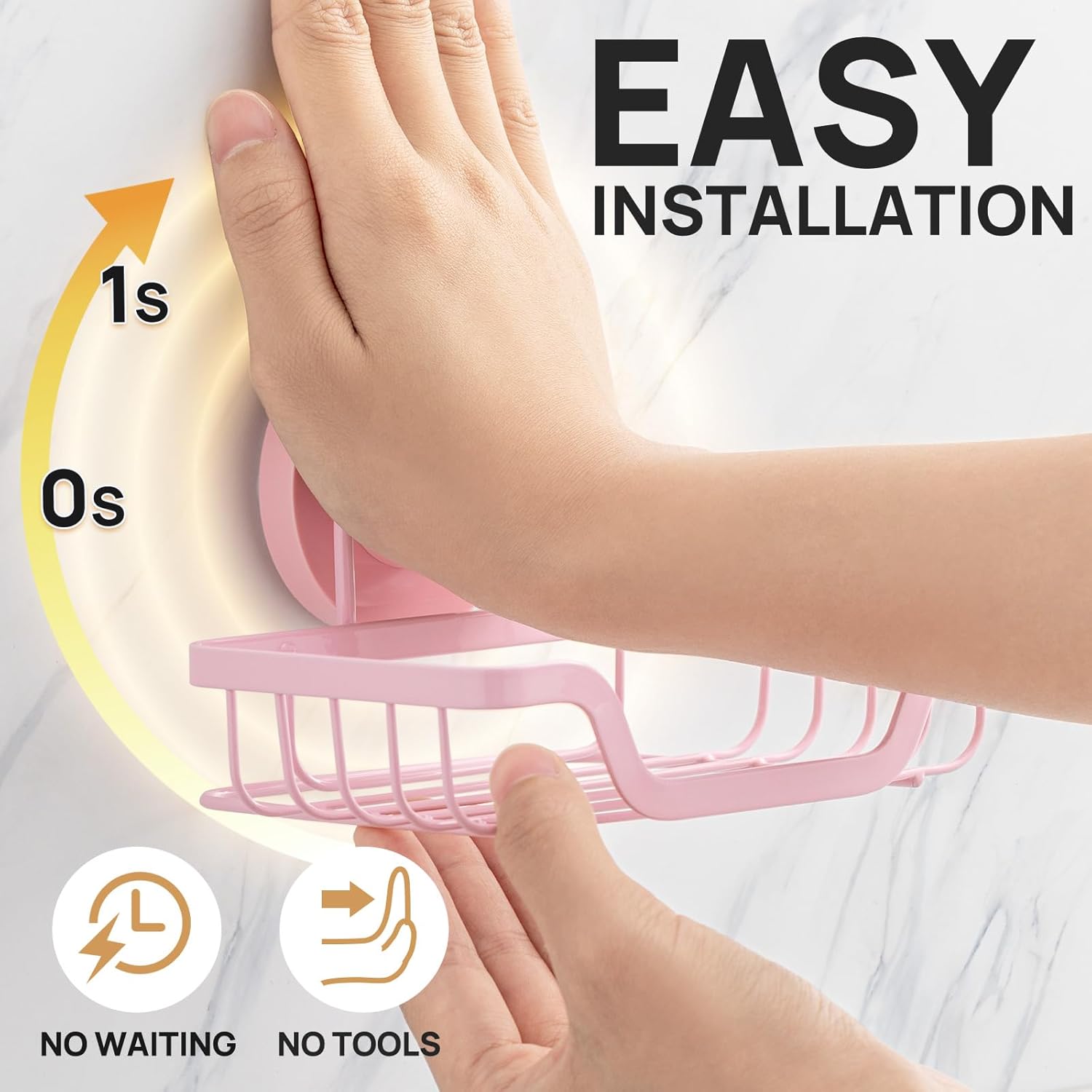 LEVERLOC Soap Dish, Soap Bar Holder for Shower Suction Cup Wall Mounted, Stainless Steel No-Drilling Removable Waterproof Sponge Holder for Bathroom Bathtub Kitchen Sink, Keep Dry, Pink