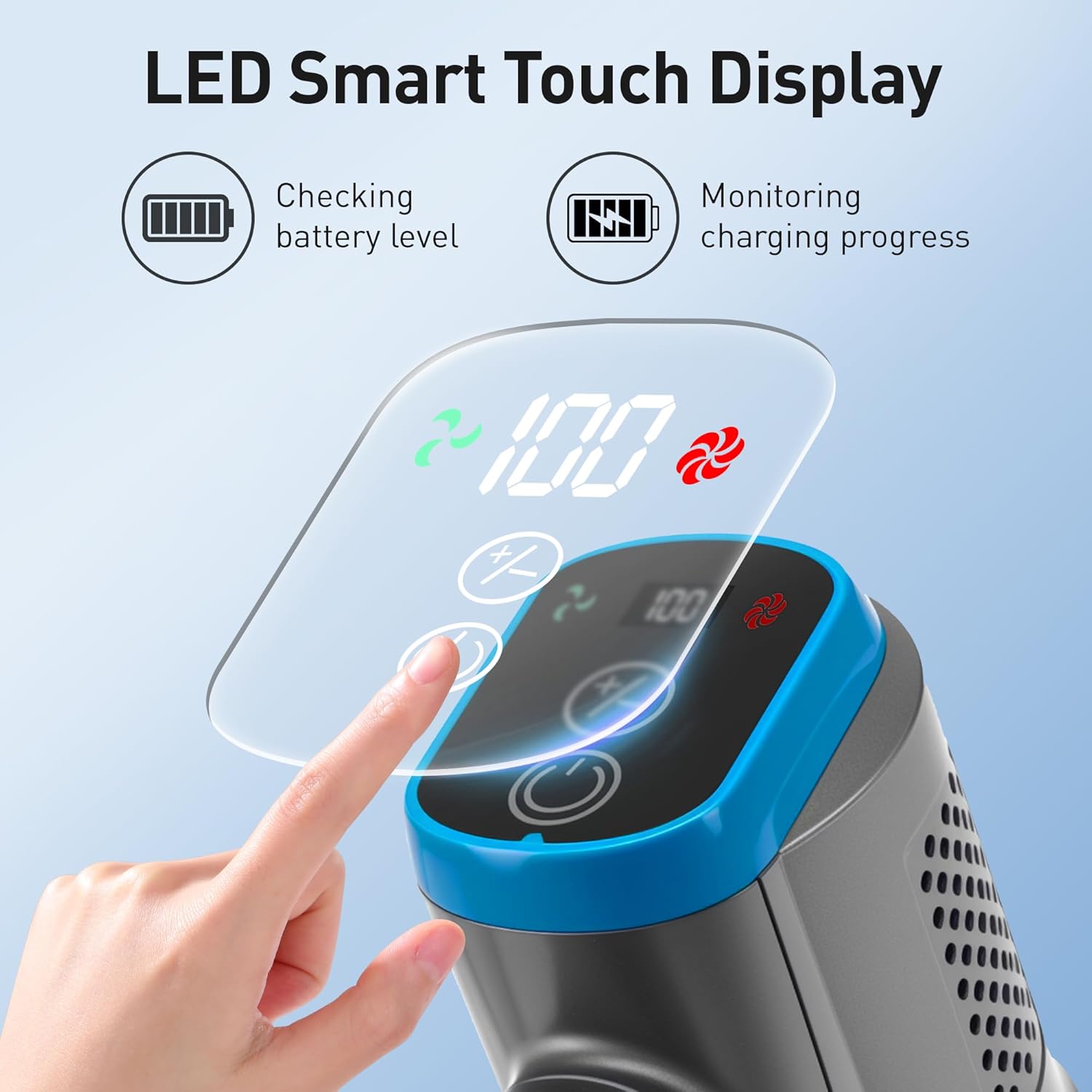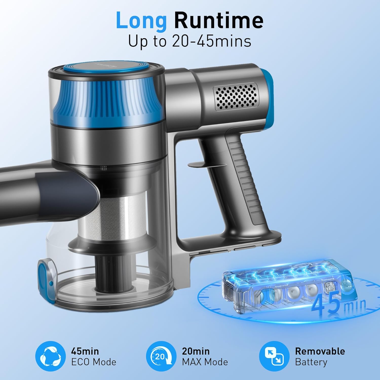 - Detachable 6×2200mAh Battery (45mins Runtime) – A single charge powers 45 mins of cleaning in Eco Mode (enough for 1500 sq.ft homes) or 25 mins in Max Mode for tough spots. The battery detaches easily: charge it separately while using a spare (not included) – no more waiting for charging to finish cleaning. Pro Tip: Fully charge the battery before first use for longer lifespan!