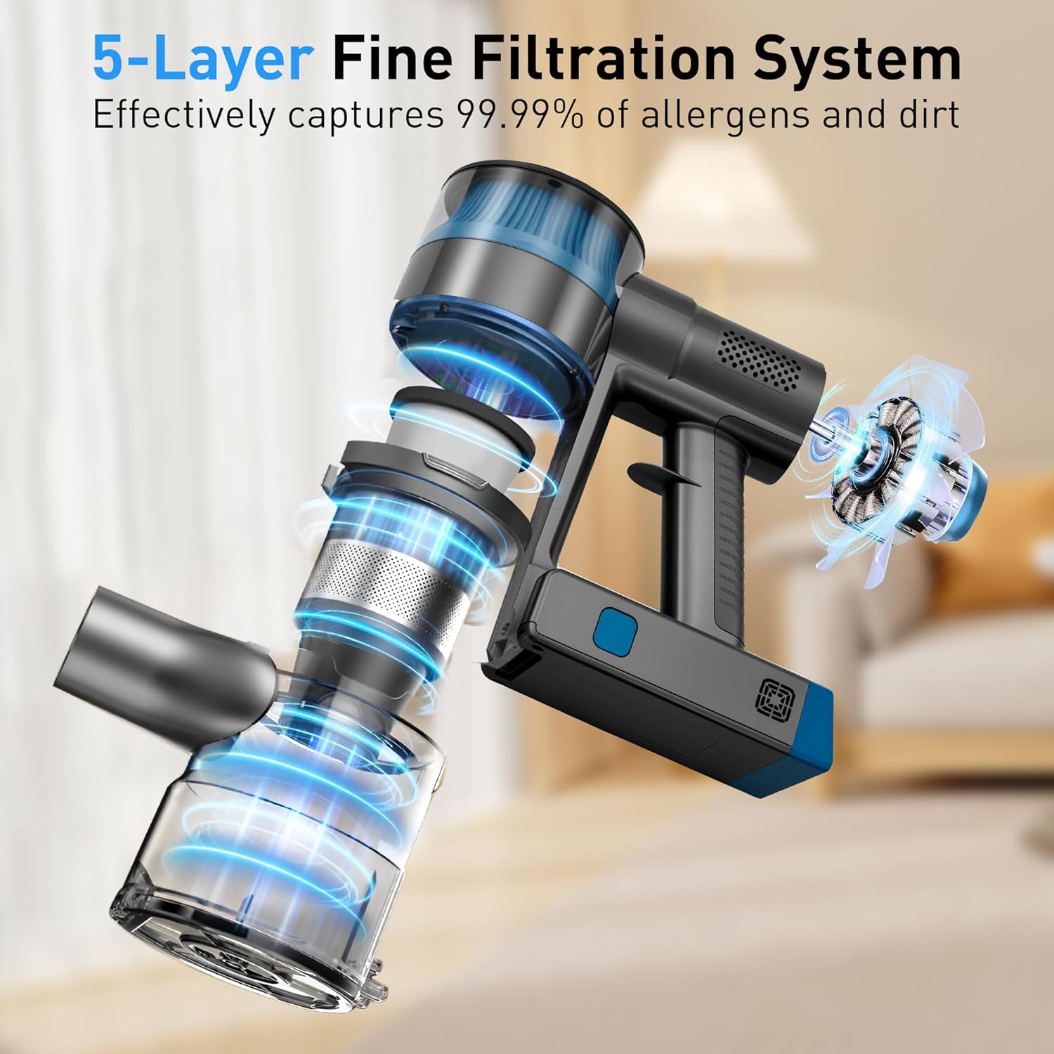 - 5-Stage HEPA Filtration (Allergy-Friendly) – Our cordless vacuum traps 99.99% of dust, pollen, and pet dander (as small as 0.3μm) – perfect for allergy sufferers and pet owners! Unlike cheap disposable filters, this HEPA filter is washable with water: rinse, dry, and reuse – save money on replacement filters for years.