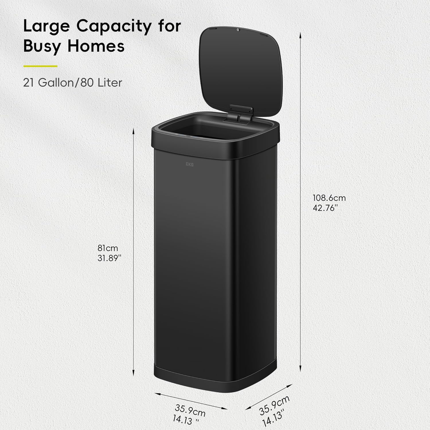 EKO EcoSmart 80L / 21.1 Gallon Motion Sensor Trash Can – Tall, Large Touchless Automatic Kitchen Garbage Bin with Soft-Close Lid for Home or Office, Brushed Stainless Steel, Matte Black