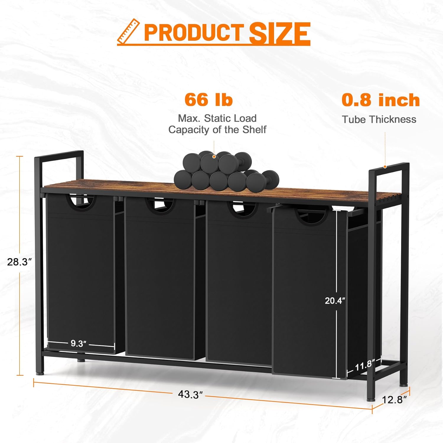 - Easy Assembly - The size of laundry basket is 43.3"D x12.8"W x 28.3"H. The laundry basket comes with a detailed instruction manual and all necessary tools and screws.