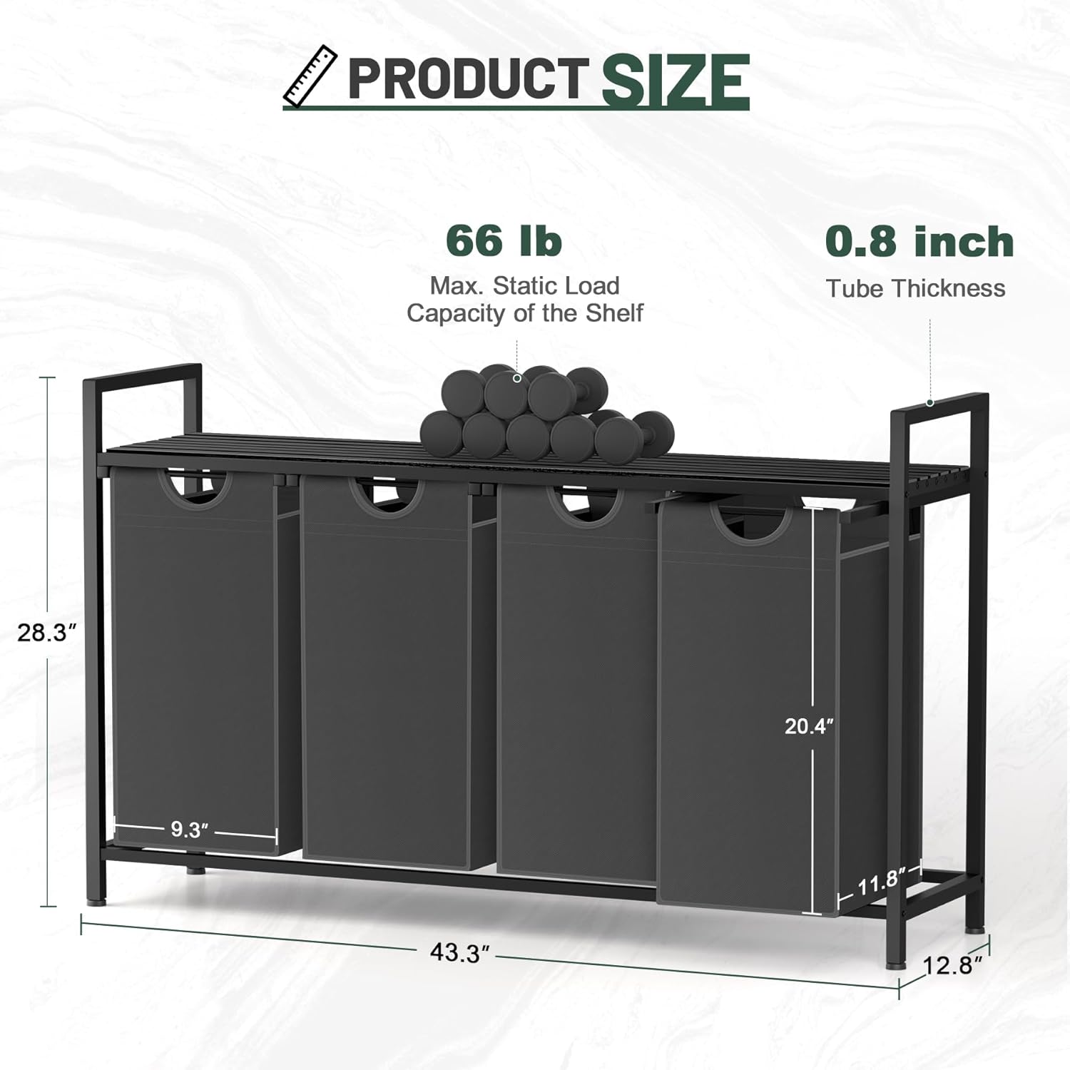 - Easy Assembly - The size of laundry basket is 43.3"D x12.8"W x 28.3"H. The laundry basket comes with a detailed instruction manual and all necessary tools and screws.