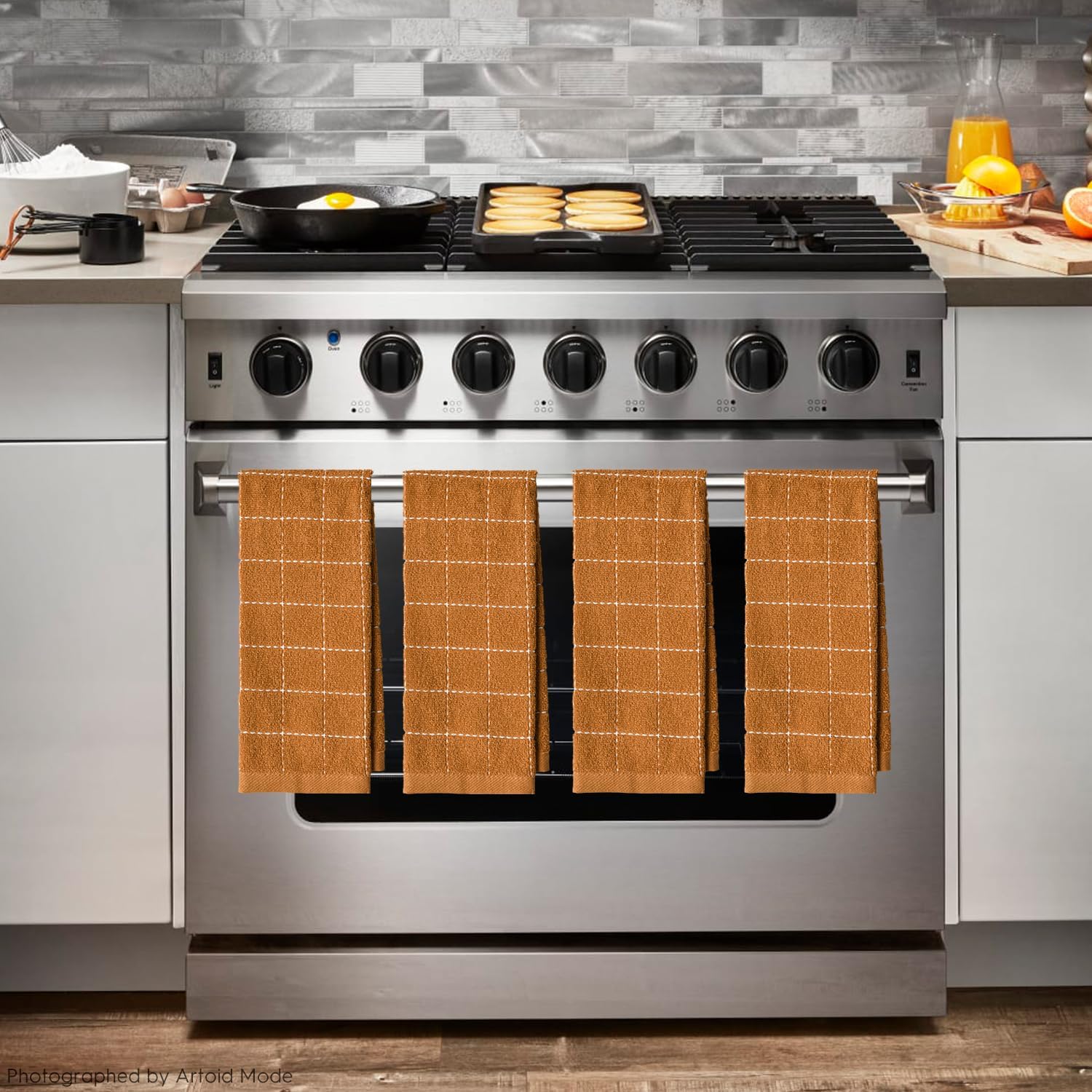 Artoid Mode Checkered Designed Cotton Caramel Orange Terry Kitchen Dish Towels, 15x25 Inch Soft Absorbent Quick Drying Cleaning Tea Towels Set of 4