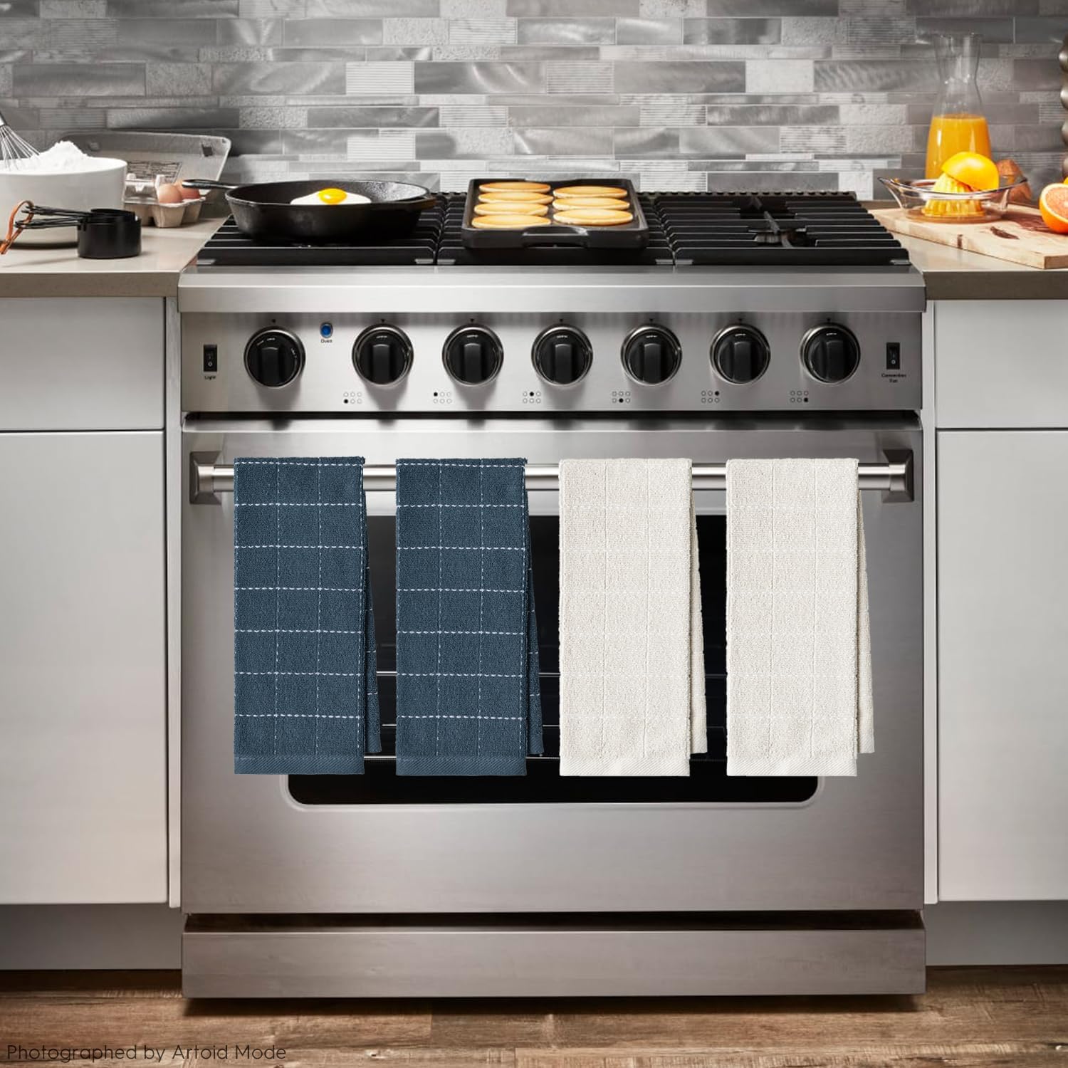Artoid Mode Checkered Designed Cotton Beige Grey Terry Kitchen Dish Towels, 15x25 Inch Soft Absorbent Quick Drying Cleaning Tea Towels Set of 4