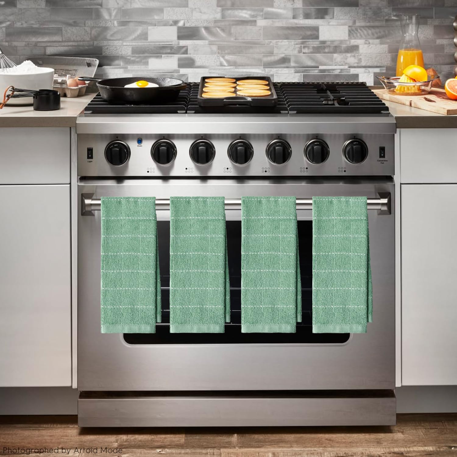 Artoid Mode Checkered Designed Cotton Light Green Terry Kitchen Dish Towels, 15x25 Inch Soft Absorbent Quick Drying Cleaning Tea Towels Set of 4