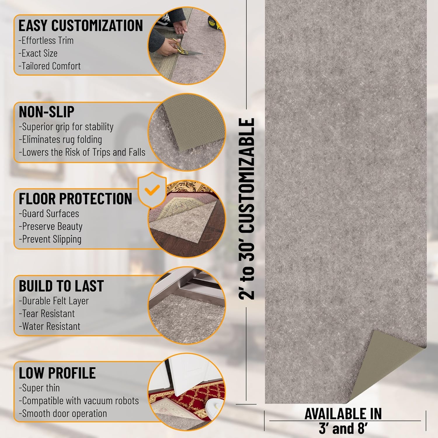 - [CUSTOM FIT FOR EVERY SPACE]: Easily cut to size with scissors to fit any rug or runner. Perfect for use throughout your home—from bedrooms and hallways to kitchens and offices.