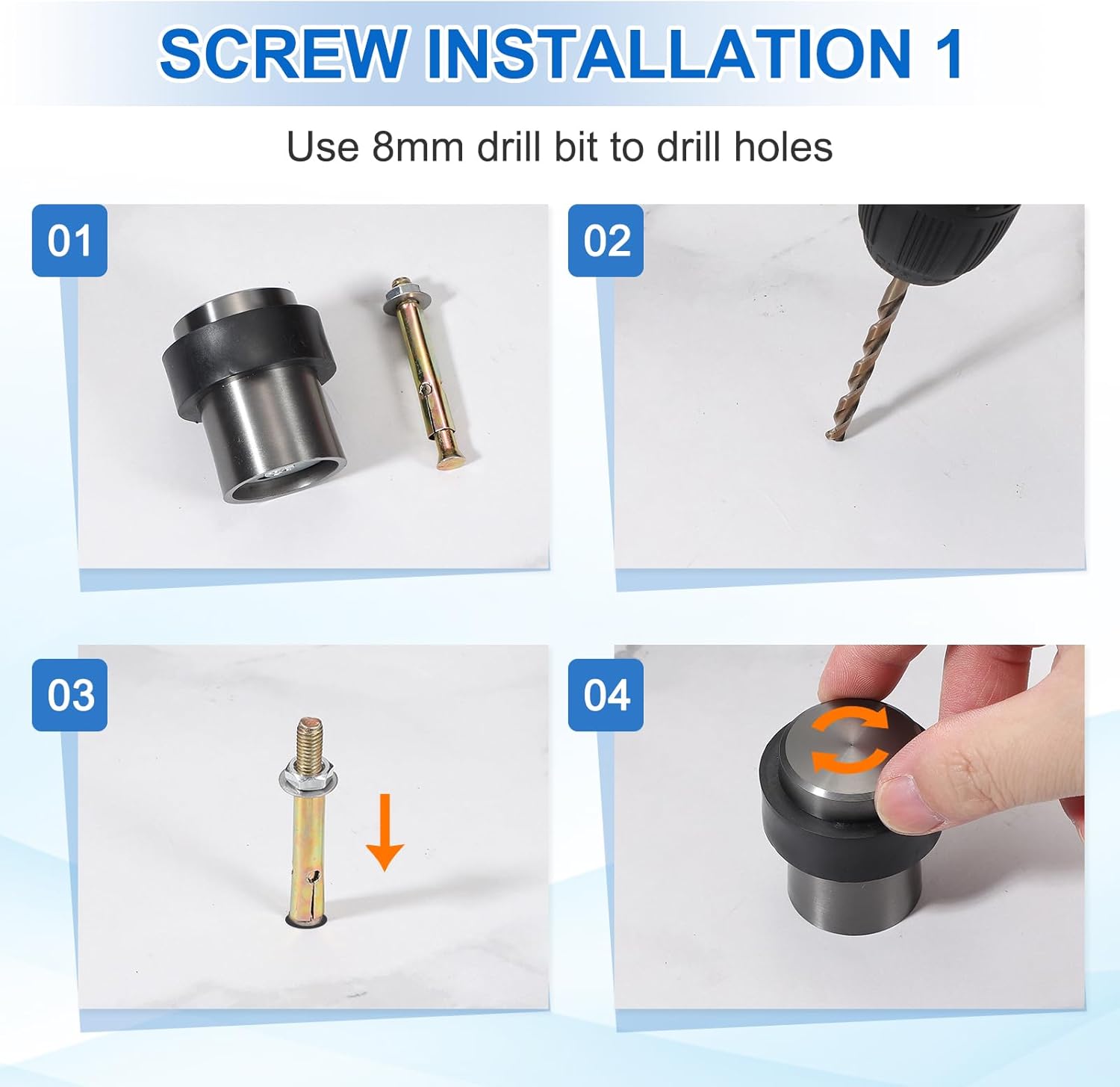 - 2 installation methods : 1.Self-adhesive floor door stops; 2. Door Stop Wedge Screw Install: