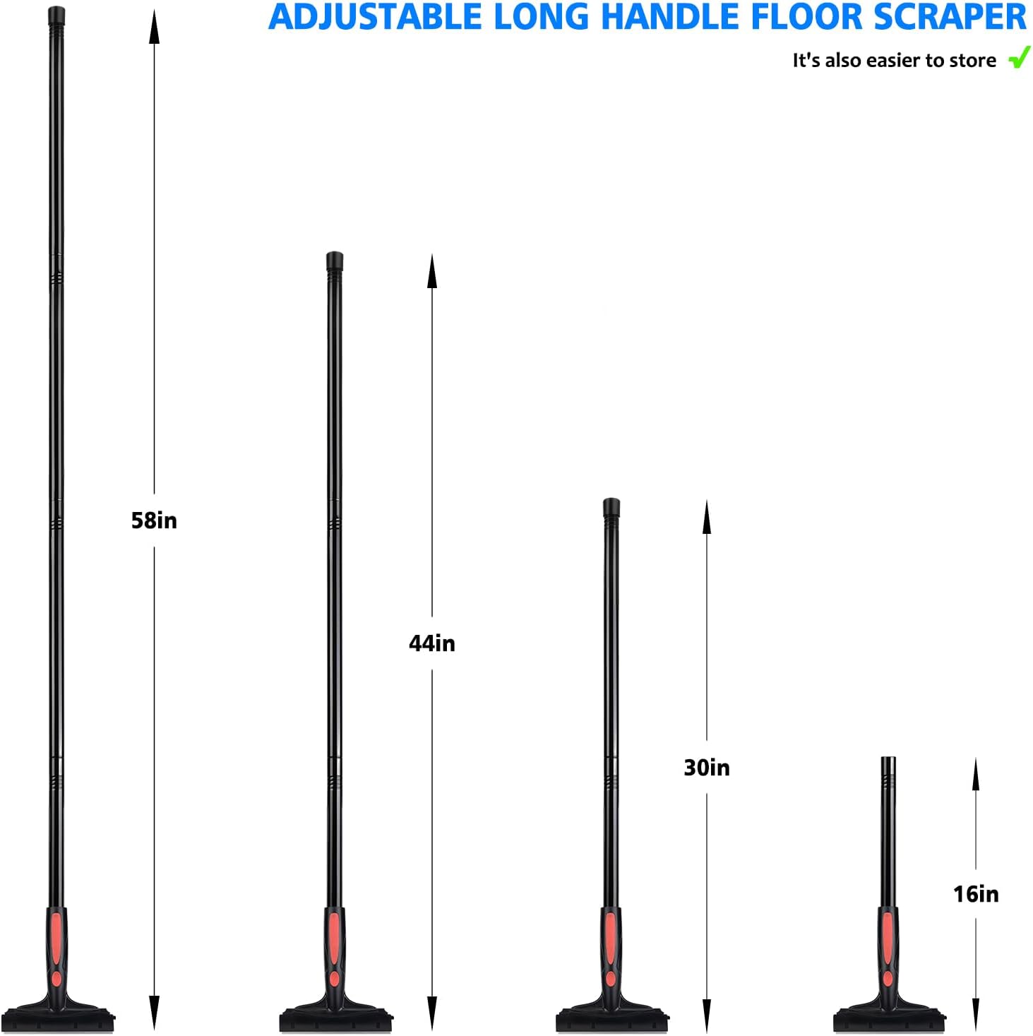 - 16''-58 '' LONG HANDLE FLOOR SCRAPER: Scraper with extension tube is about 16'', come with 3 pcs detachable extension tube,the handle length can be extended as needed - making this a versatile scraper - whether for walls, kitchen cooktop, or for the ceiling.