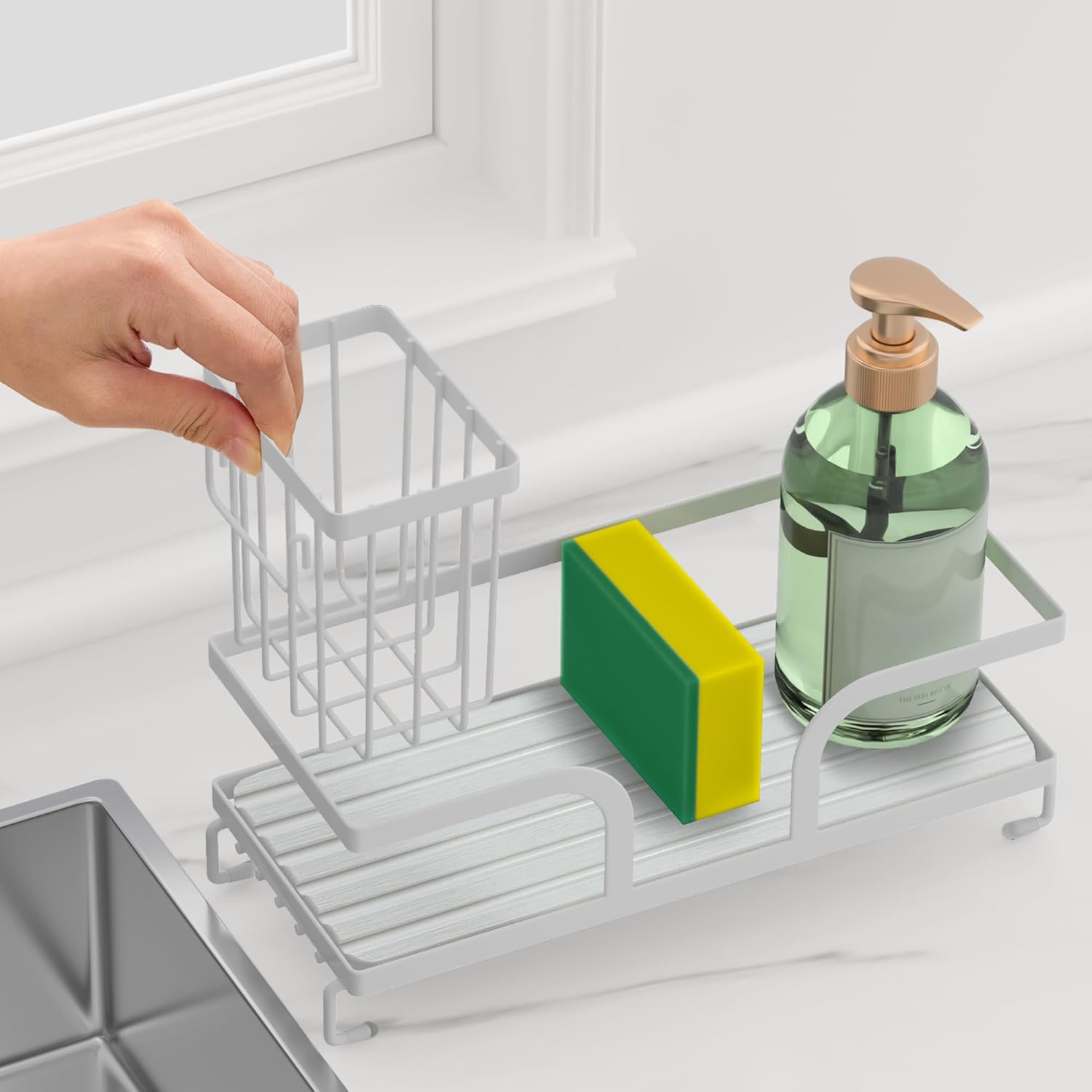 - VERSATILE DESIGN: Kitchen sink caddy organizer with dedicated compartments for sponges, scrubbers, soap dispenser, and other cleaning supplies