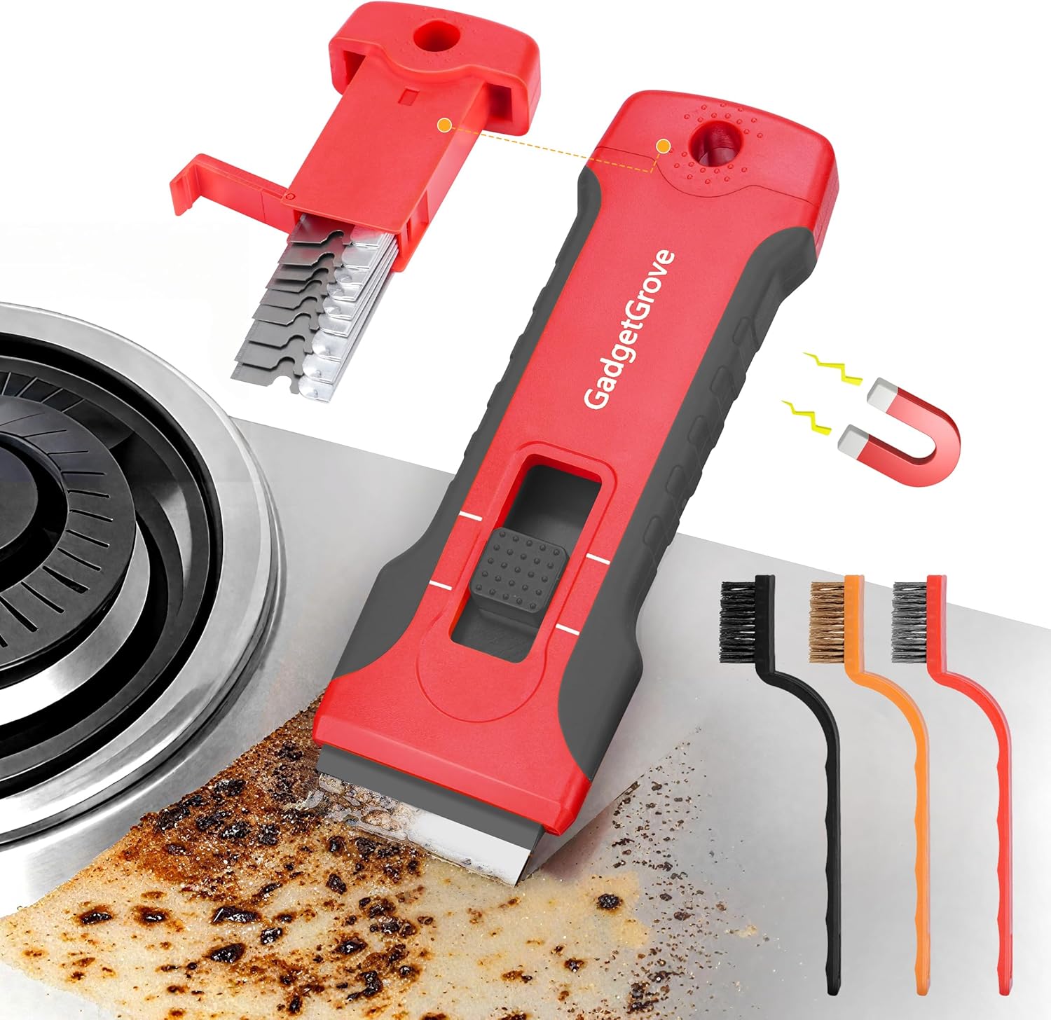 Upgraded Razor Blade Scraper with 10pcs Blades and 3Pcs small wire brushes,Scraper Tool for Cleaning Glass Window, Cooktop, Oven, Stove Scraper, Razor Scraper with Buit-In Blade Storage, Gray